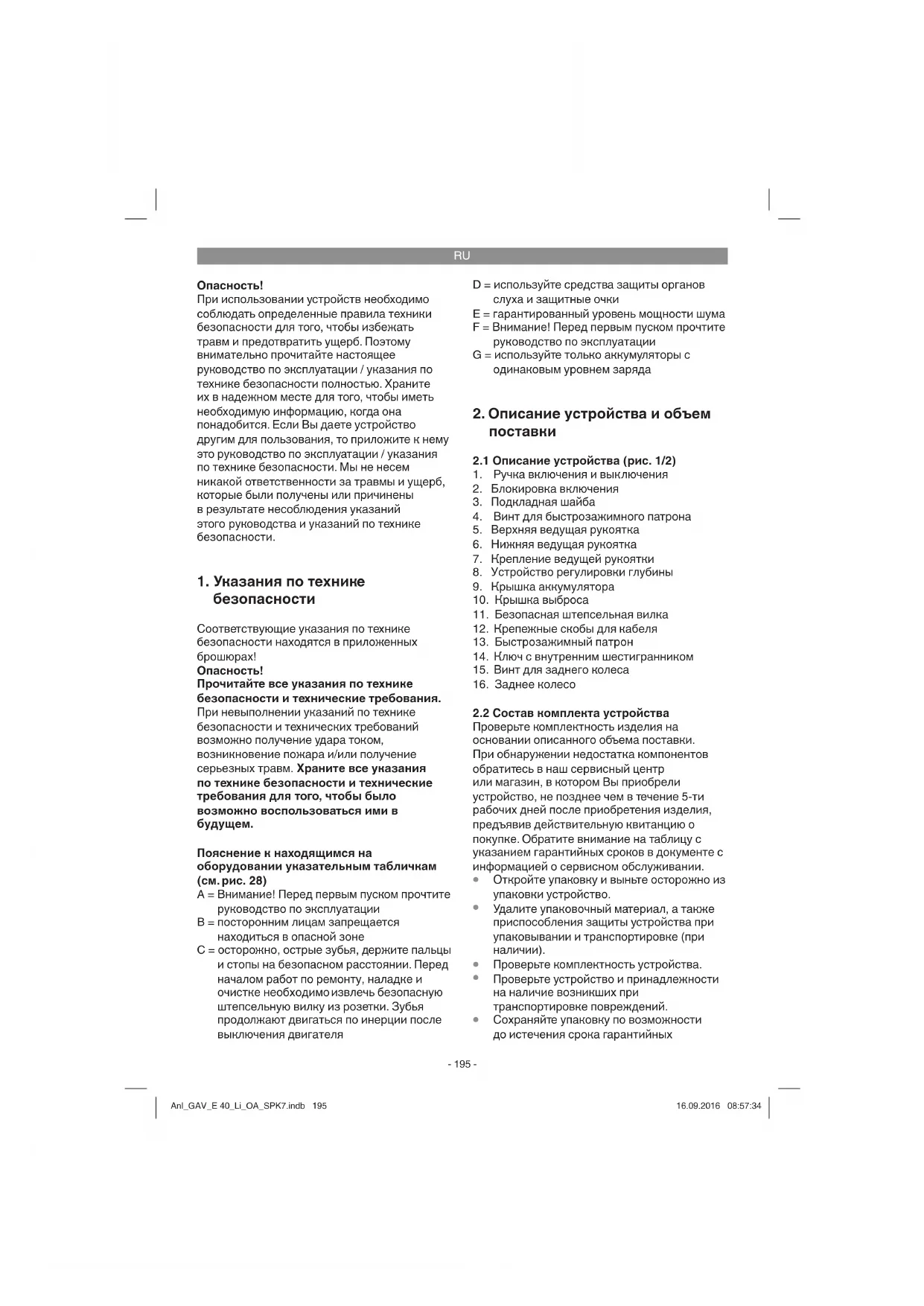 воздействия вибрации на руку при длительном использовании устройства или при неправильном пользовании и ненадлежащем техническом уходе. Осторожно! Данное устройство во время работы создает электромагнитное поле. Это электромагнитное поле при определенных условиях может нарушить работу активных или пассивных медицинских имплантатов. Чтобы избежать опасности получения серьезных или смертельных травм, мы рекомендуем лицам с медицинскими имплантатами обратиться за консультацией к врачу или производителю медицинского имплантата, прежде чем использовать устройство. Anl_GAV_E 40_Li_OA_SPK7.indb 197Anl_GAV_E 40_Li_OA_SPK7.indb 197 16.09.2016 08:57:3416.09.2016 08:57:34RU