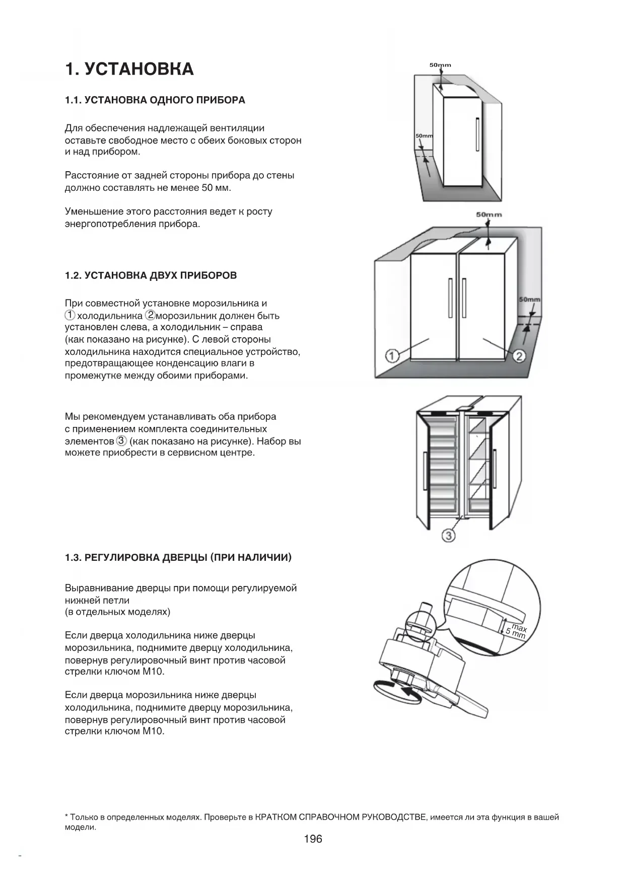1.1. УСТАНОВКА ОДНОГО ПРИБОРА Дляобеспечениянадлежащейвентиляции оставьтесвободноеместособеихбоковыхсторон инадприбором. Расстояниеотзаднейстороныприборадостены должносоставлятьнеменее50мм. Уменьшениеэтогорасстоянияведеткросту энергопотребленияприбора. 1.2. УСТАНОВКА ДВУХ ПРИБОРОВ Присовместнойустановкеморозильникаи