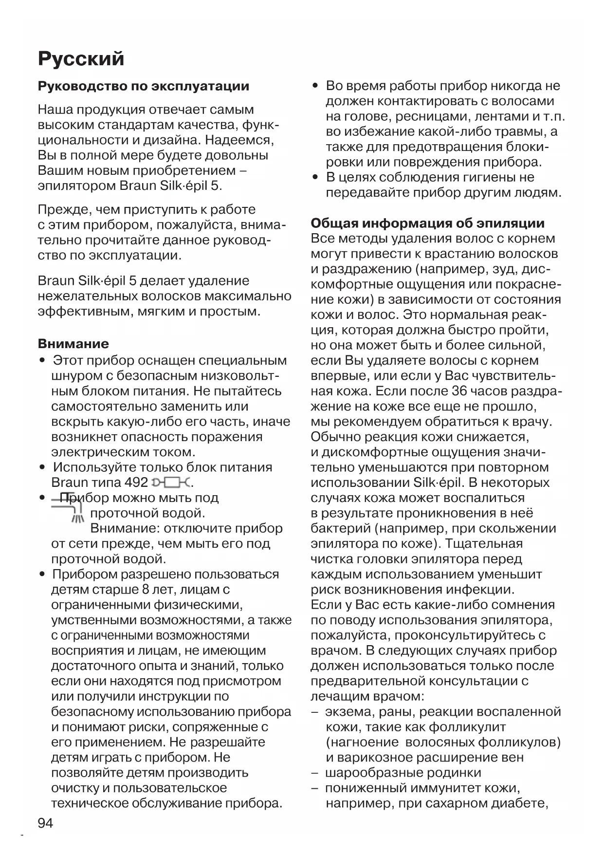 - В целях соблюдения гигиены не передавайте прибор другим людям. Общая информация об эпиляции Все методы удаления волос с корнем могут привести к врастанию волосков и раздражению (например, зуд, дис- комфортные ощущения или покрасне- ние кожи) в зависимости от состояния кожи и волос. Это нормальная реак- ция, которая должна быстро пройти, но она может быть и более сильной, если Вы удаляете волосы с корнем впервые, или если у Вас чувствитель- ная кожа. Если после 36 часов раздра- жение на коже все еще не прошло, мы рекомендуем обратиться к врачу. Обычно реакция кожи снижается, и дискомфортные ощущения значи- тельно уменьшаются при повторном использовании Silk·épil. В некоторых случаях кожа может воспалиться в результате проникновения в неё бактерий (например, при скольжении эпилятора по коже). Тщательная чистка головки эпилятора перед каждым использованием уменьшит риск возникновения инфекции. Если у Вас есть какие-либо сомнения по поводу использования эпилятора, пожалуйста, проконсультируйтесь с врачом. В следующих случаях прибор должен использоваться только после предварительной консультации с лечащим врачом: – экзема, раны, реакции воспаленной кожи, такие как фолликулит (нагноение волосяных фолликулов) и варикозное расширение вен – шарообразные родинки – пониженный иммунитет кожи, например, при сахарном диабете,