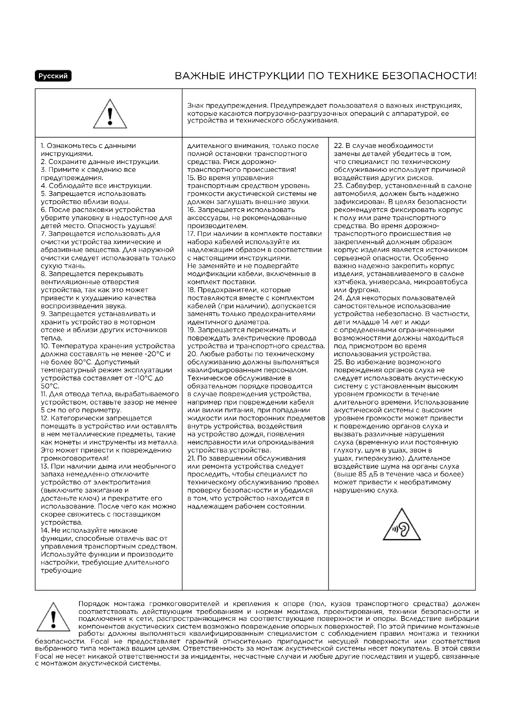 Порядок монтажа громкоговорителей и крепления к опоре (пол, кузов транспортного средства) должен соответствовать действующим требованиям и нормам монтажа, проектирования, техники безопасности и подключения к сети, распространяющимся на соответствующие поверхности и опоры. Вследствие вибрации компонентов акустических систем возможно повреждение опорных поверхностей. По этой причине монтажные работы должны выполняться квалифицированным специалистом с соблюдением правил монтажа и техники безопасности. Focal не предоставляет гарантий относительно пригодности несущей поверхности или соответствия выбранного типа монтажа вашим целям. Ответственность за монтаж акустической системы несет покупатель. В этой связи Focal не несет никакой ответственности за инциденты, несчастные случаи и любые другие последствия и ущерб, связанные с монтажом акустической системы. Знак предупреждения. Предупреждает пользователя о важных инструкциях, которые касаются погрузочно-разгрузочных операций с аппаратурой, ее устройства и технического обслуживания.