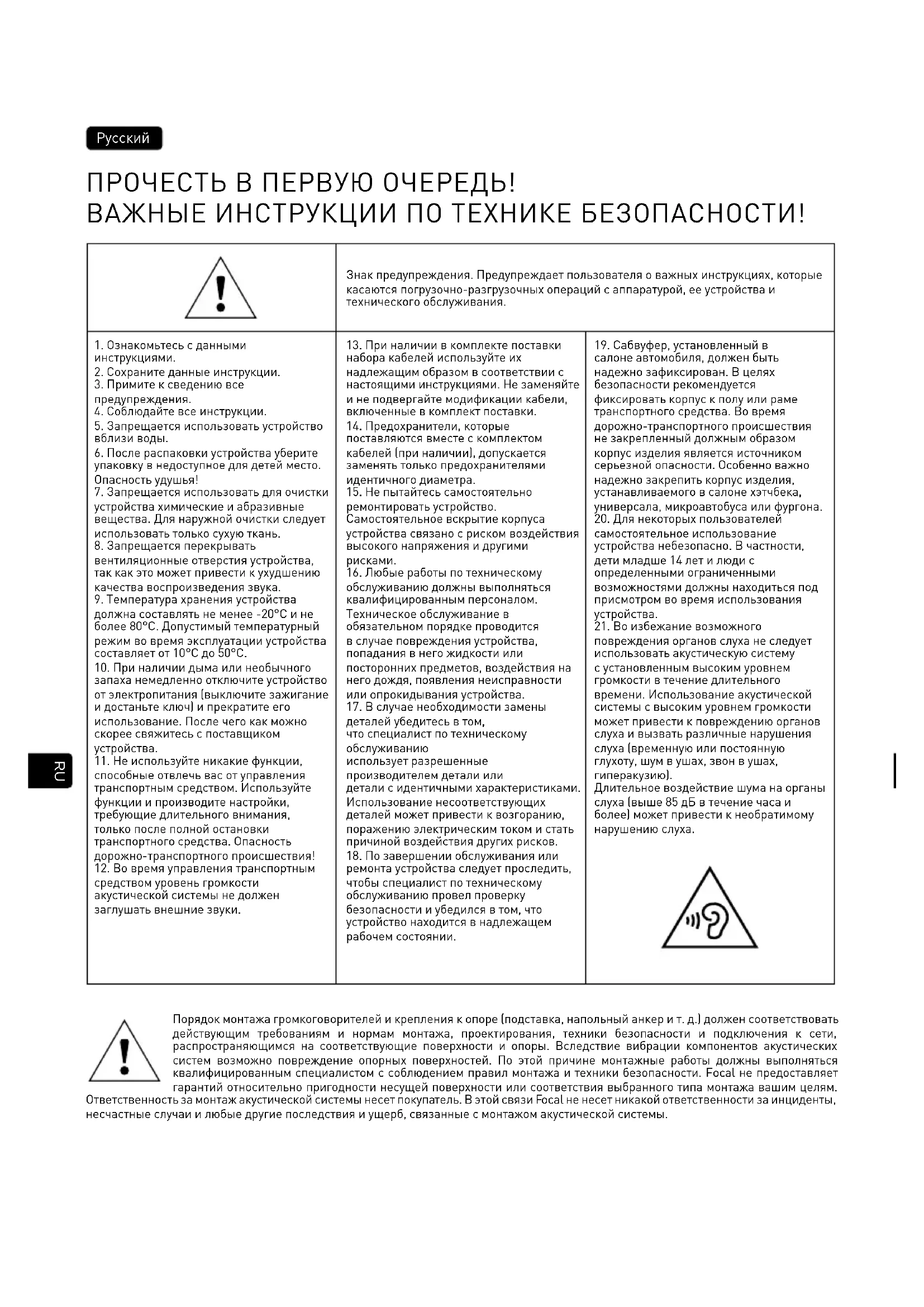 повреждения органов слуха не следует использовать акустическую систему с установленным высоким уровнем громкости в течение длительного времени. Использование акустической системы с высоким уровнем громкости может привести к повреждению органов слуха и вызвать различные нарушения слуха (временную или постоянную глухоту, шум в ушах, звон в ушах, гиперакузию). Длительное воздействие шума на органы слуха (выше 85 дБ в течение часа и более) может привести к необратимому нарушению слуха. Порядок монтажа громкоговорителей и крепления к опоре (подставка, напольный анкер и т. д.) должен соответствовать действующим требованиям и нормам монтажа, проектирования, техники безопасности и подключения к сети, распространяющимся на соответствующие поверхности и опоры. Вследствие вибрации компонентов акустических систем возможно повреждение опорных поверхностей. По этой причине монтажные работы должны выполняться квалифицированным специалистом с соблюдением правил монтажа и техники безопасности. Focal не предоставляет гарантий относительно пригодности несущей поверхности или соответствия выбранного типа монтажа вашим целям. Ответственность за монтаж акустической системы несет покупатель. В этой связи Focal не несет никакой ответственности за инциденты, несчастные случаи и любые другие последствия и ущерб, связанные с монтажом акустической системы.