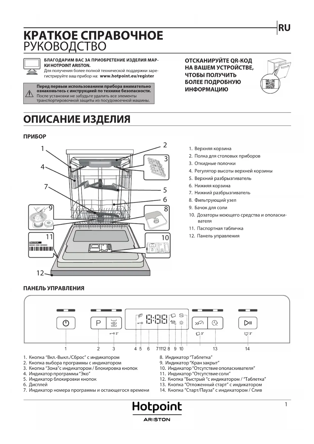 1. Верхняя корзина2. Полка для столовых приборов3. Откидные полочки4. Регулятор высоты верхней корзины5. Верхний разбрызгиватель6. Нижняя корзина7. Нижний разбрызгиватель8. Фильтрующий узел9. Бачок для соли10. Дозаторы моющего средства и ополаски-вателя11. Паспортная табличка12. Панель управленияБЛАГОДАРИМ ВАС ЗА ПРИОБРЕТЕНИЕ ИЗДЕЛИЯ МАР-КИ HOTPOINT ARISTON. Для получения более полной технической поддержки заре-гистрируйте ваш прибор на: www.hotpoint.eu/register