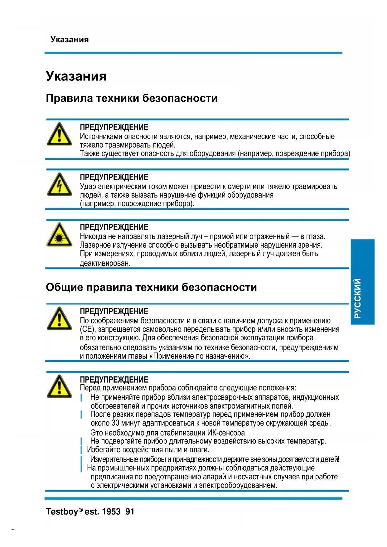 ПРЕДУПРЕЖДЕНИЕ Перед применением прибора соблюдайте следующие положения: | Не применяйте прибор вблизи электросварочных аппаратов, индукционных обогревателей и прочих источников электромагнитных полей. | После резких перепадов температур перед применением прибор должен около 30 минут адаптироваться к новой температуре окружающей среды. Это необходимо для стабилизации ИК-сенсора. | Не подвергайте прибор длительному воздействию высоких температур. | Избегайте воздействия пыли и влаги. | Измерительные приборы и принадлежности держите вне зоны досягаемости детей! | На промышленных предприятиях должны соблюдаться действующие предписания по предотвращению аварий и несчастных случаев при работе с электрическими установками и электрооборудованием.Указания 92 Testboy