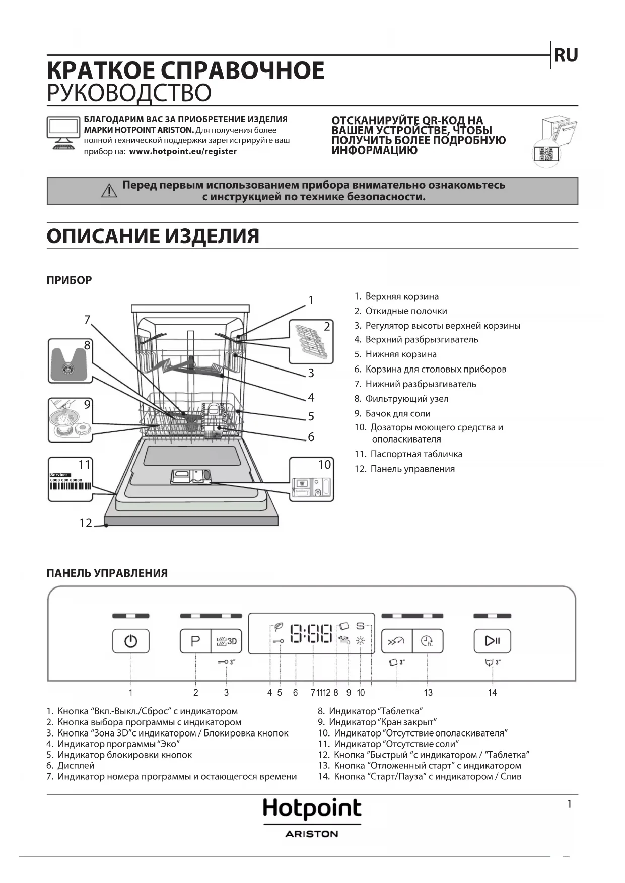 Перед первым использованием прибора внимательно ознакомьтесь с инструкцией по технике безопасности. 1. Верхняя корзина2. Откидные полочки3. Регулятор высоты верхней корзины4. Верхний разбрызгиватель5. Нижняя корзина6. Корзина для столовых приборов7. Нижний разбрызгиватель8. Фильтрующий узел9. Бачок для соли10. Дозаторы моющего средства и ополаскивателя11. Паспортная табличка12. Панель управленияБЛАГОДАРИМ ВАС ЗА ПРИОБРЕТЕНИЕ ИЗДЕЛИЯ МАРКИ HOTPOINT ARISTON. Для получения более полной технической поддержки зарегистрируйте ваш прибор на: www.hotpoint.eu/register0000 000 00000 Service:
