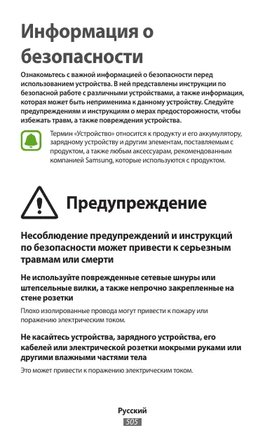 Информация о безопасности Ознакомьтесь с важной информацией о безопасности перед использованием устройства. В ней представлены инструкции по безопасной работе с различными устройствами, а также информация, которая может быть неприменима к данному устройству. Следуйте предупреждениям и инструкциям о мерах предосторожности, чтобы избежать травм, а также повреждения устройства. Термин «Устройство» относится к продукту и его аккумулятору, зарядному устройству и другим элементам, поставляемым с продуктом, а также любым аксессуарам, рекомендованным компанией Samsung, которые используются с продуктом.