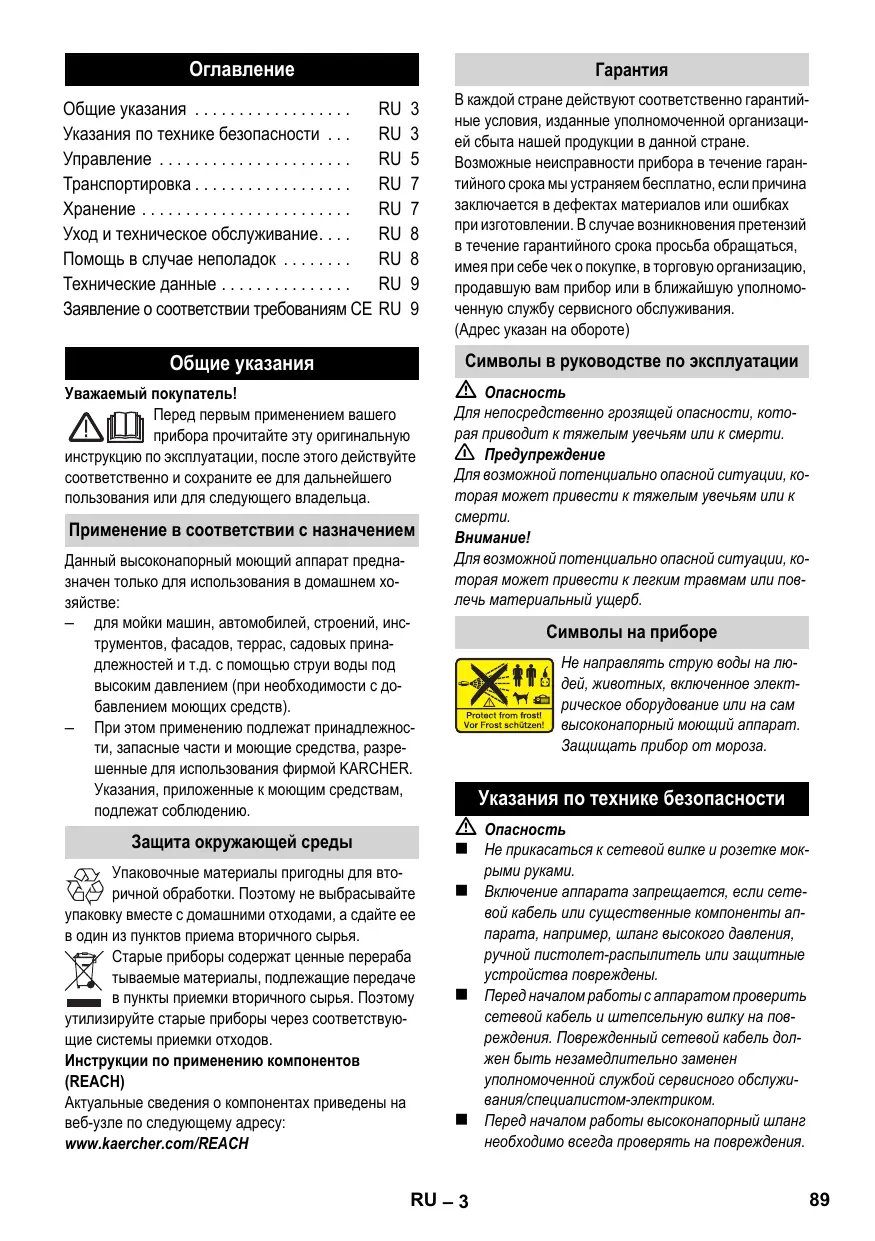 Не прикасаться к сетевой вилке и розетке мок- Упаковочные материалы пригодны для вторичной обработки. Поэтому не выбрасывайте упаковку вместе с домашними отходами, а сдайте ее в один из пунктов приема вторичного сырья. Старые приборы содержат ценные перераба тываемые материалы, подлежащие передаче в пункты приемки вторичного сырья. Поэтому утилизируйте старые приборы через соответствующие системы приемки отходов. Инструкции по применению компонентов (REACH) Актуальные сведения о компонентах приведены на веб-узле по следующему адресу: www.kaercher.com/REACH рыми руками. Включение аппарата запрещается, если сетевой кабель или существенные компоненты аппарата, например, шланг высокого давления, ручной пистолет-распылитель или защитные устройства повреждены. Перед началом работы с аппаратом проверить сетевой кабель и штепсельную вилку на повреждения. Поврежденный сетевой кабель должен быть незамедлительно заменен уполномоченной службой сервисного обслуживания/специалистом-электриком. Перед началом работы высоконапорный шланг необходимо всегда проверять на повреждения. RU – 3