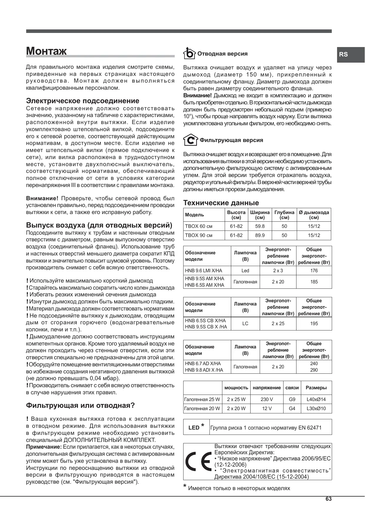 Для правильного монтажа изделия смотрите схемы, приведенные на первых страницах настоящего рук оводства. М онтаж должен выполняться квалифицированным персоналом. Электрическое подсоединение Сетевое напряжение должно с оответствовать значению, указанному на табличке с характеристиками, расположенной внутри вытяжки. Если изделие укомплектовано штепсельной вилкой, подсоедините его к сетевой розетке, соответствующей действующим нормативам, в доступном месте. Если изделие не имеет штепсельной вилки (прямое подключение к сети), или вилка расположена в труднодоступном месте, установите двухполюсный выключатель, соответствующий нормативам, обеспечивающий полное отключение от сети в условиях категории перенапряжения III в соответствии с правилами монтажа. Внимание! Проверьте, чтобы сетевой провод был установлен правильно, перед подсоединением проводки вытяжки к сети, а также его исправную работу. Выпуск воздуха (для отводных версий) Подсоедините вытяжку к трубам и настенным отводным отверстиям с диаметром, равным выпускному отверстию воздуха (соединительный фланец). Использование труб и настенных отверстий меньшего диаметра сократит КПД вытяжки и значительно повысит шумовой уровень. Поэтому производитель снимает с себя всякую ответственность. ! Используйте максимально короткий дымоход ! Старайтесь максимально сократить число колен дымохода ! Избегать резких изменений сечения дымохода ! Изнутри дымоход должен быть максимально гладким. ! Материал дымохода должен соответствовать нормативам ! Не подсоединяйте вытяжку к дымоходам, отводящим дым от сгорания горючего (водонагревательные колонки, печи и т.п.). ! Дымоудаление должно соответствовать инструкциям компетентных органов. Кроме того удаляемый воздух не должен проходить через стенные отверстия, если эти отверстия специально не предназначены для этой цели. ! Оборудуйте помещение вентиляционными отверстиями во избежание создания негативного давления вытяжкой (не должно превышать 0,04 мбар). ! Производитель снимает с себя всякую ответственность в случае нарушения этих правил. Фильтрующая или отводная? ! Ваша кухонная вытяжка готова к эксплуатации в отводном режиме. Для использования вытяжки в фильтрующем режиме необходимо установить специальный ДОПОЛНИТЕЛЬНЫЙ КОМПЛЕКТ. Примечание: Если прилагается, как в некоторых случаях, дополнительная фильтрующая система с активированным углем может быть уже установлена в вытяжку. Инструкции по переоснащению вытяжки из отводной версии в фильтрующую приводятся в настоящем руководстве (см. "Фильтрующая версия"). Отводная версия