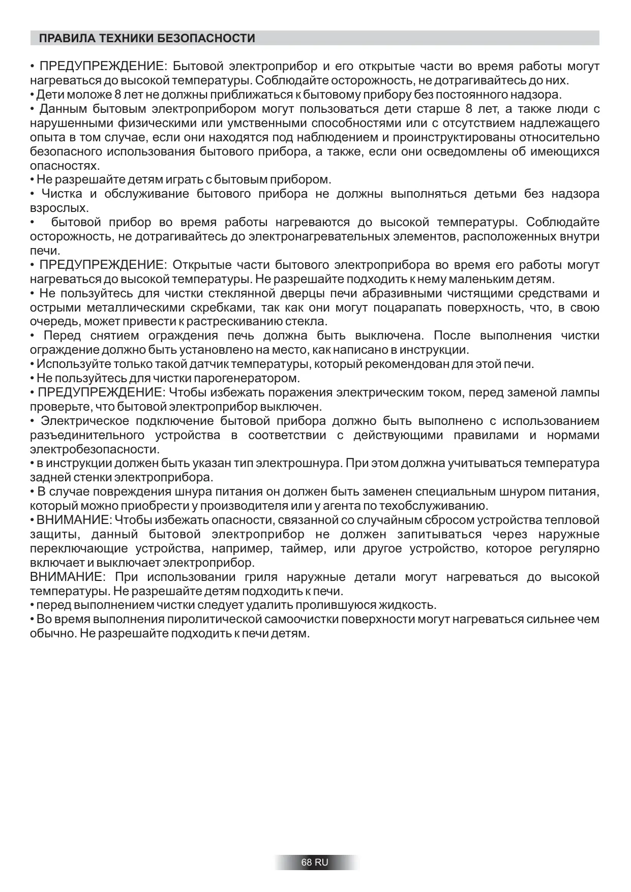 - Во время выполнения пиролитической самоочистки поверхности могут нагреваться сильнее чем обычно. Не разрешайте подходить к печи детям. 68 RU