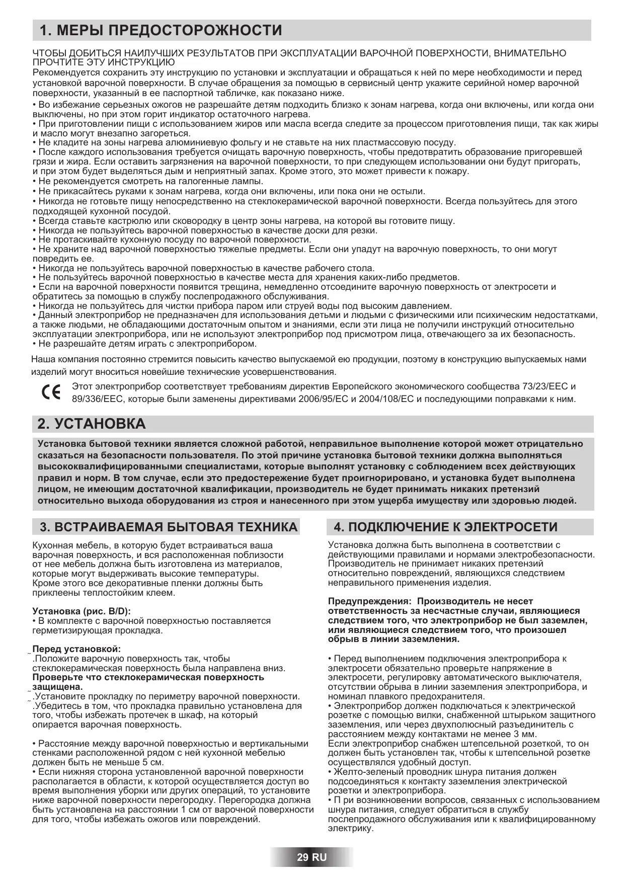 - Если нижняя сторона установленной варочной поверхности располагается в области, к которой осуществляется доступ во время выполнения уборки или других операций, то установите ниже варочной поверхности перегородку. Перегородка должна быть установлена на расстоянии 1 см от варочной поверхности для того, чтобы избежать ожогов или повреждений. 29 RU Предупреждения: Производитель не несет ответственность за несчастные случаи, являющиеся следствием того, что электроприбор не был заземлен, или являющиеся следствием того, что произошел обрыв в линии заземления.