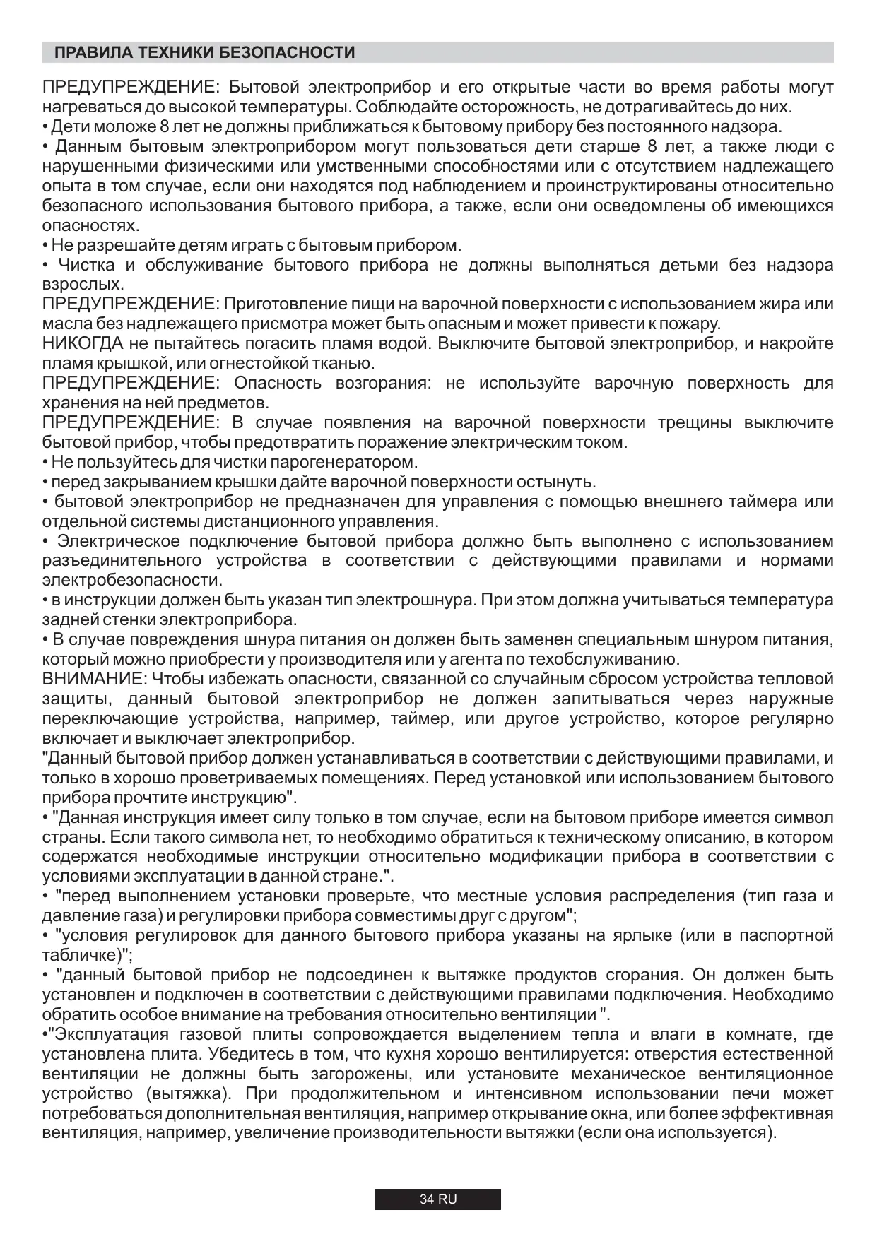 - "Эксплуатация газовой плиты сопровождается выделением тепла и влаги в комнате, где установлена плита. Убедитесь в том, что кухня хорошо вентилируется: отверстия естественной вентиляции не должны быть загорожены, или установите механическое вентиляционное устройство (вытяжка). При продолжительном и интенсивном использовании печи может потребоваться дополнительная вентиляция, например открывание окна, или более эффективная вентиляция, например, увеличение производительности вытяжки (если она используется). 34 RU