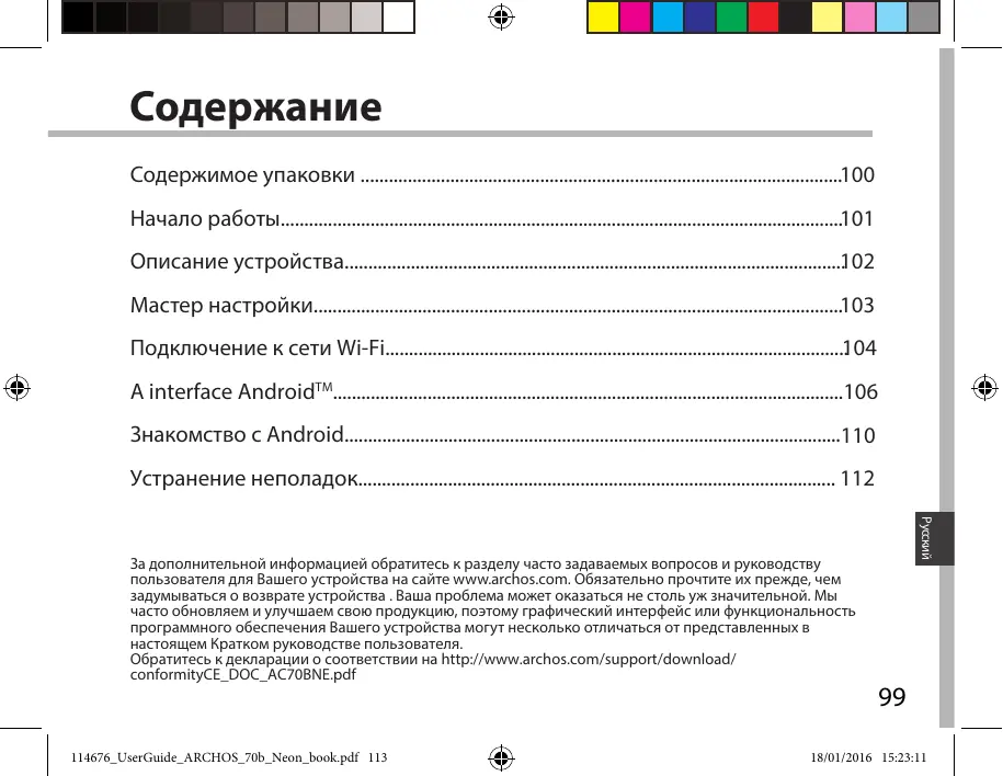 За дополнительной информацией обратитесь к разделу часто задаваемых вопросов и руководству пользователя для Вашего устройства на сайте www.archos.com. Обязательно прочтите их прежде, чем задумываться о возврате устройства . Ваша проблема может оказаться не столь уж значительной. Мы часто обновляем и улучшаем свою продукцию, поэтому графический интерфейс или функциональность программного обеспечения Вашего устройства могут несколько отличаться от представленных в настоящем Кратком руководстве пользователя. Обратитесь к декларации о соответствии на http://www.archos.com/support/download/ conformityCE_DOC_AC70BNE.pdf