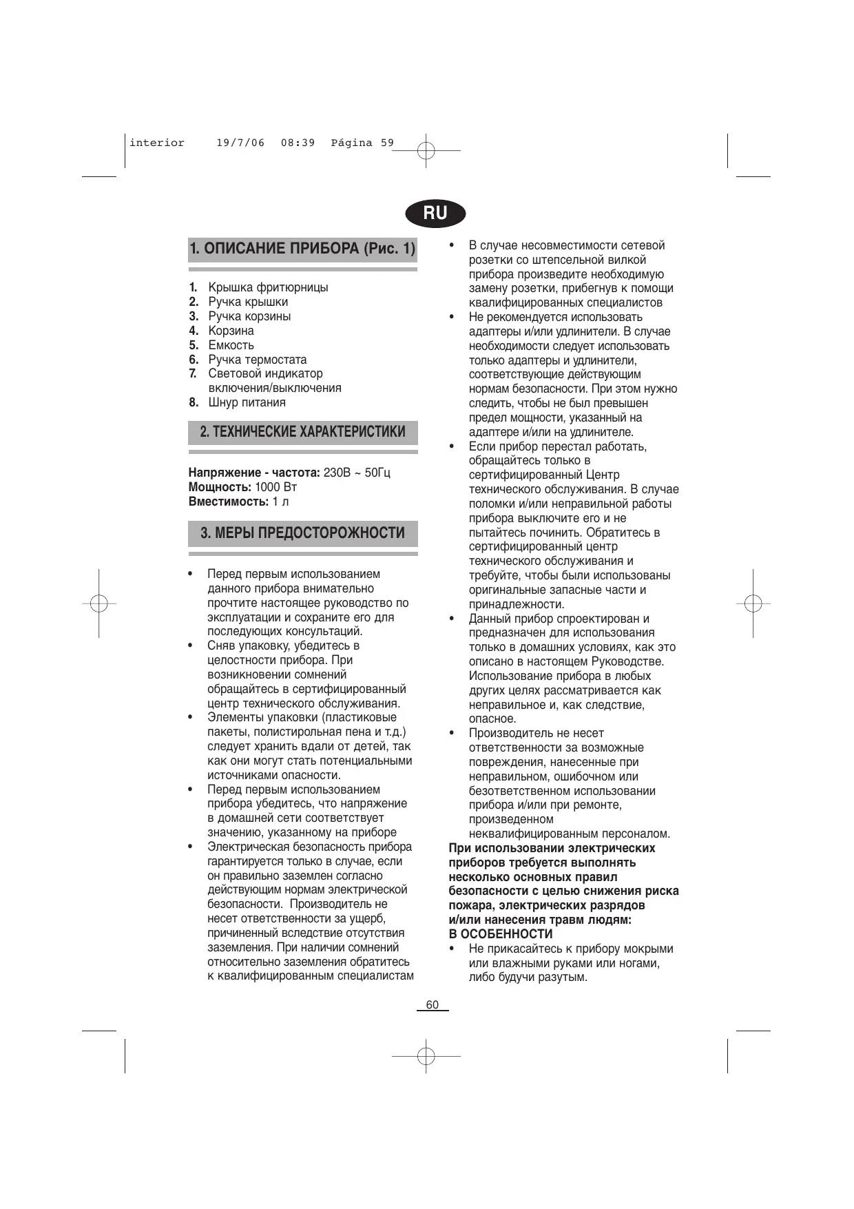 19/7/06 08:39 Página 60 В целях защиты от электрических разрядов не погружайте корпус с элементами управления и нагревательным элементом в воду и не промывайте эти детали под водопроводным краном. НЕ ПРИКАСАЙТЕСЬ К ГОРЯЧИМ ПОВЕРХНОСТЯМ – ИСПОЛЬЗУЙТЕ ВНИМАНИЕ: ПРИБОР ВО ВРЕМЯ РАБОТЫ ОЧЕНЬ СИЛЬНО НАГРЕВАЕТСЯ. ПОЭТОМУ СЛЕДУЕТ ПРИНЯТЬ НЕОБХОДИМЫЕ МЕРЫ ВО ИЗБЕЖАНИЕ РИСКА ПОЛУЧЕНИЯ ОЖЕГОВ, ВОЗГОРАНИЯ И НАНЕСЕНИЯ ДРУГИХ ПОВРЕЖДЕНИЙ ЛЮДЯМ ИЛИ НЕ ПЕРЕМЕЩАЙТЕ ПРИБОР ВО ВРЕМЯ РАБОТЫ ИЛИ ВО ВРЕМЯ ОСТЫВАНИЯ МАСЛА. Не забывайте, что жир может испортиться или даже загореться, если его нагревать в течение длительного времени до высоких температур. В случае возгорания немедленно отключите прибор от электросети, закройте емкость для масла крышкой, чтобы перекрыть доступ воздуха и потушить огонь. Для тушения огня никогда не используйте воду. Отключите прибор от электросети, если вы не собираетесь его использовать, а также перед любыми операциями по уходу и Для отключения прибора от электросети сначала переместите переключатель в положение "0", а затем отсоедините шнур питания от Не оставляйте работающий прибор без присмотра. Отключайте его от электросети, даже если вы отходите на короткое время. Дайте маслу остыть, перед тем как помыть и убрать прибор. Не используйте прибор, если его шнур питания или штепсельная вилка повреждены, либо в случае