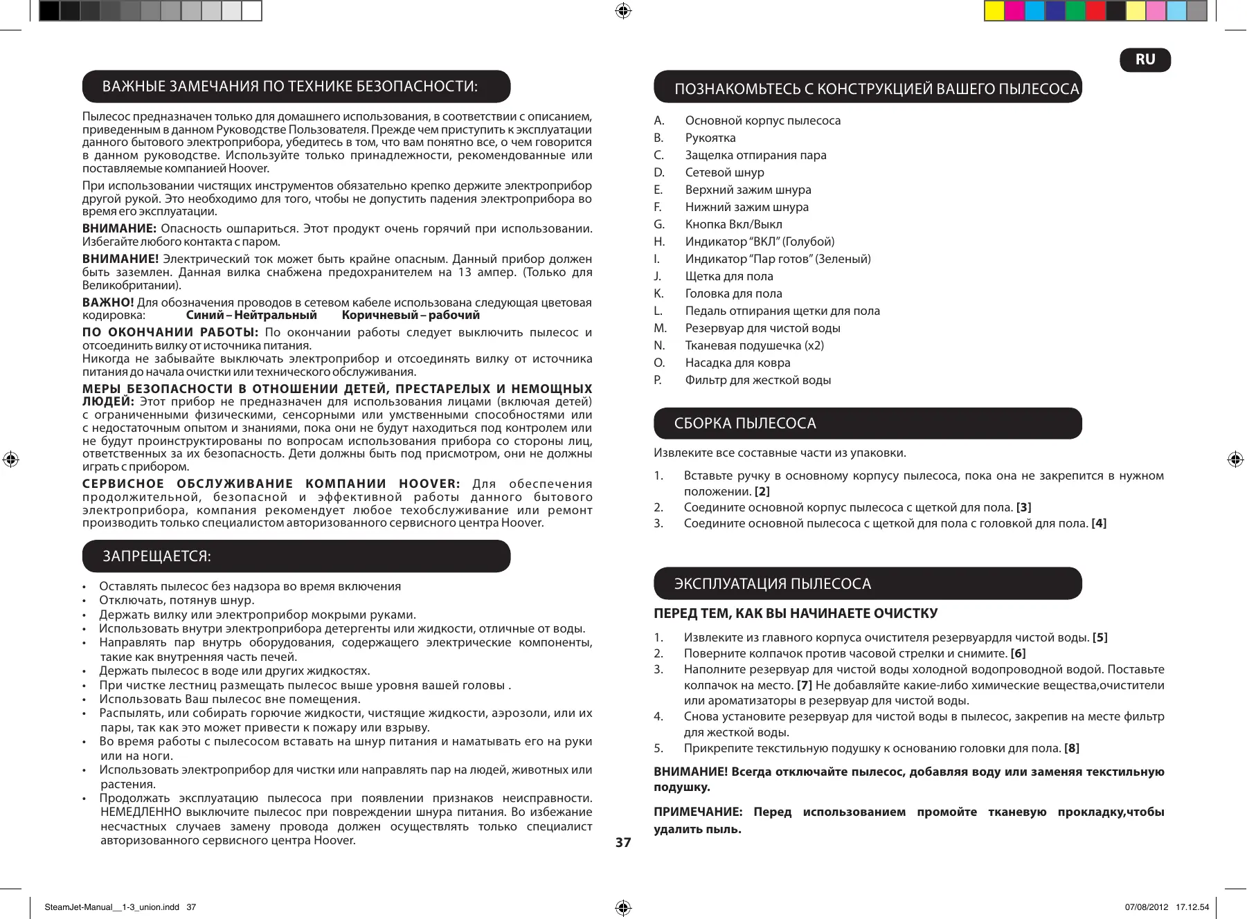 Оставлять пылесос без надзора во время включения Отключать, потянув шнур. Держать вилку или электроприбор мокрыми руками. Использовать внутри электроприбора детергенты или жидкости, отличные от воды. Направлять пар внутрь оборудования, содержащего электрические компоненты, такие как внутренняя часть печей. Держать пылесос в воде или других жидкостях. При чистке лестниц размещать пылесос выше уровня вашей головы . Использовать Ваш пылесос вне помещения. Распылять, или собирать горючие жидкости, чистящие жидкости, аэрозоли, или их пары, так как это может привести к пожару или взрыву. Во время работы с пылесосом вставать на шнур питания и наматывать его на руки или на ноги. Использовать электроприбор для чистки или направлять пар на людей, животных или Продолжать эксплуатацию пылесоса при появлении признаков неисправности. НЕМЕДЛЕННО выключите пылесос при повреждении шнура питания. Во избежание несчастных случаев замену провода должен осуществлять только специалист авторизованного сервисного центра Hoover. SteamJet-Manual__1-3_union.indd 37 Эксплуатация пылесоса ПЕРЕД ТЕМ, КАК ВЫ НАЧИНАЕТЕ ОЧИСТКУ