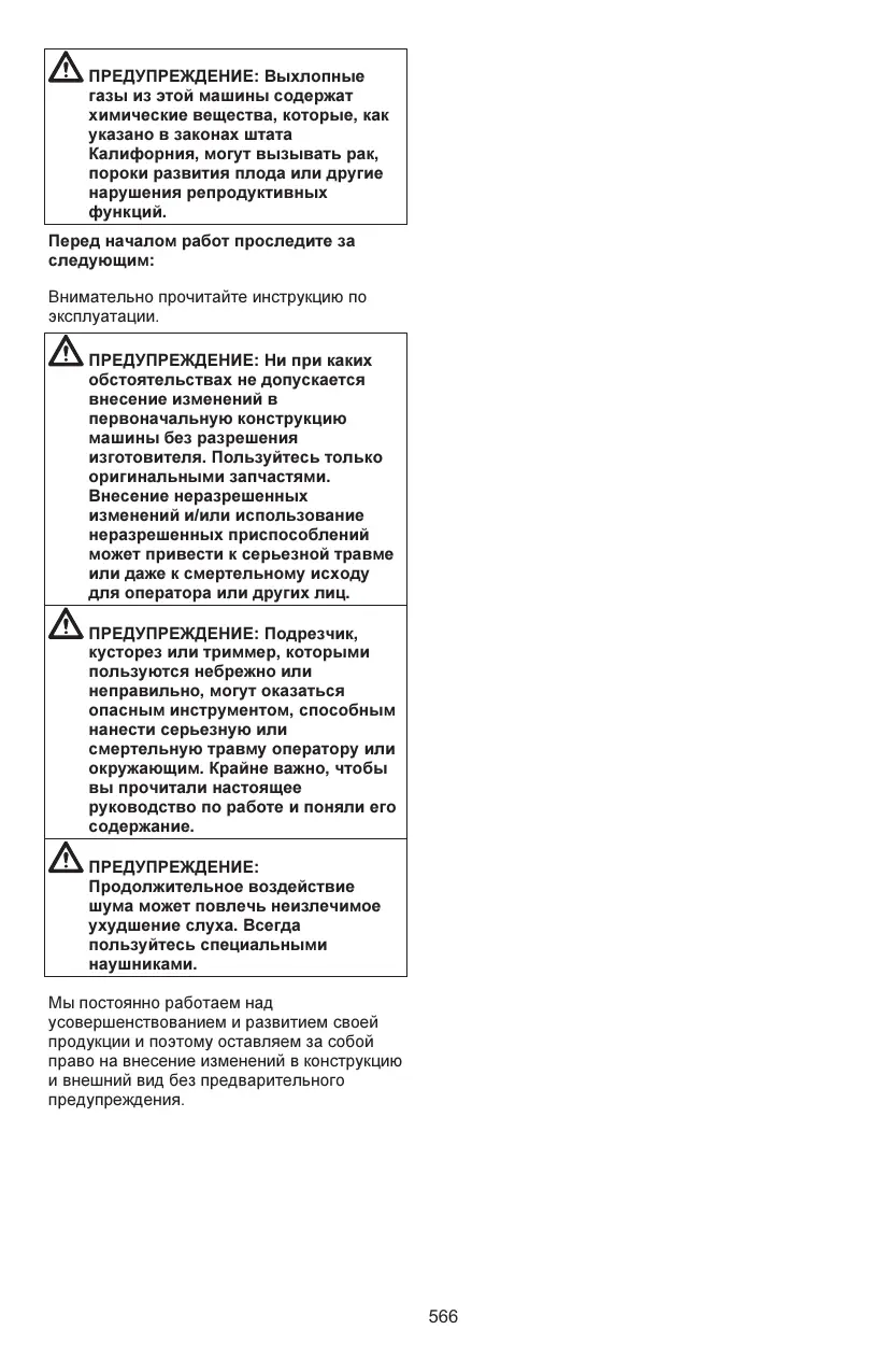 Contrôler les points suivants avant la mise en marche : Lisez attentivement le manuel d’utilisation. AVERTISSEMENT : Ne jamais modifier sous aucun prétexte la machine sans l’autorisation du fabricant. N’utiliser que des accessoires et des pièces d’origine. Des modifications nonautorisées et l’emploi d’accessoires non-homologués peuvent provoquer des accidents graves et même mortels, à l’utilisateur ou d’autres personnes. AVERTISSEMENT : Utilisés de manière négligente ou erronée, les scies d'éclaircissement et les coupe-herbes peuvent devenir des outils dangereux pouvant occasionner des blessures très graves, voire mortelles à l’utilisateur ou à d’autres personnes présentes. Il est très important de lire attentivement et de bien assimiler le contenu de ce manuel de l'opérateur. AVERTISSEMENT : Une exposition prolongée au bruit risque de causer des lésions auditives permanentes. Toujours utiliser des protecteurs d'oreilles agréés. Nous travaillons continuellement au développement de ses produits et nous réservons le droit d’en modifier, entre autres, la conception et l’aspect sans préavis.