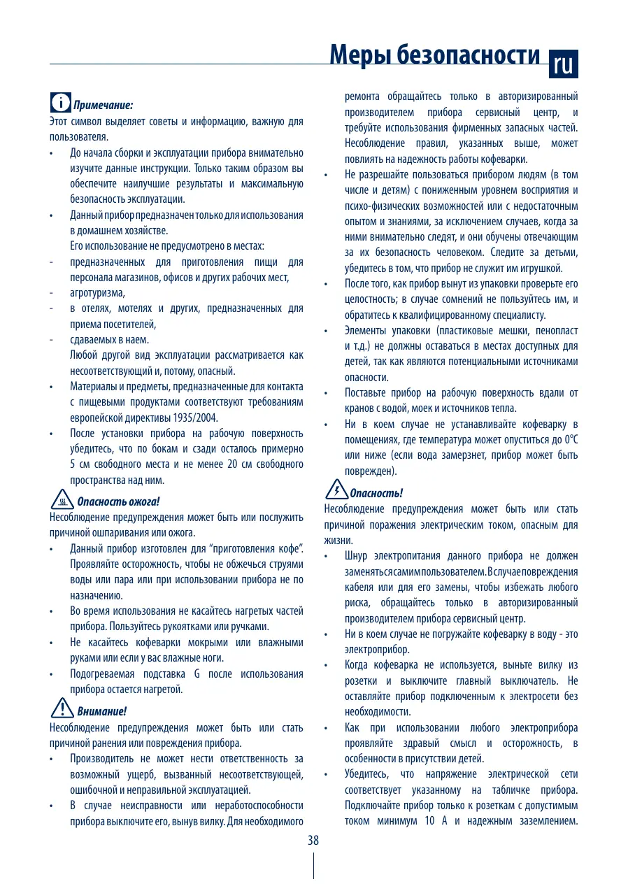 Опасность ожога! Несоблюдение предупреждения может быть или послужить причиной ошпаривания или ожога. • Данный прибор изготовлен для “приготовления кофе”. Проявляйте осторожность, чтобы не обжечься струями воды или пара или при использовании прибора не по назначению. • Во время использования не касайтесь нагретых частей прибора. Пользуйтесь рукоятками или ручками. • Не касайтесь кофеварки мокрыми или влажными руками или если у вас влажные ноги. • Подогреваемая подставка G после использования прибора остается нагретой. Внимание! Несоблюдение предупреждения может быть или стать причиной ранения или повреждения прибора. • Производитель не может нести ответственность за возможный ущерб, вызванный несоответствующей, ошибочной и неправильной эксплуатацией. • В случае неисправности или неработоспособности прибора выключите его, вынув вилку. Для необходимого