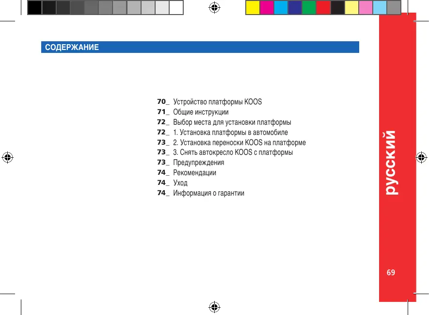 1. Installation de la plateforme dans le véhicule 2. Installation de la coque KOOS sur la plateforme 3. Retirer la coque KOOS de la base Avertissements Recommandations Entretien Informations sur la garantie