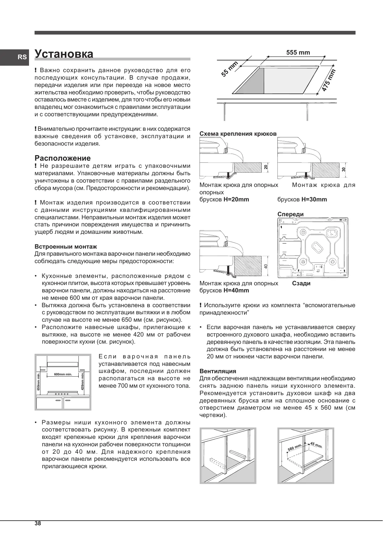 Aération Pour garantir une bonne aération, la cavité d’encastrement doit être dépourvue de paroi arrière. Il est conseillé d’installer le four de manière à ce qu’il repose sur deux cales en bois ou bien sur un plan d’appui continu qui ait une découpe d’au moins 45 x 560 mm (voir figures).