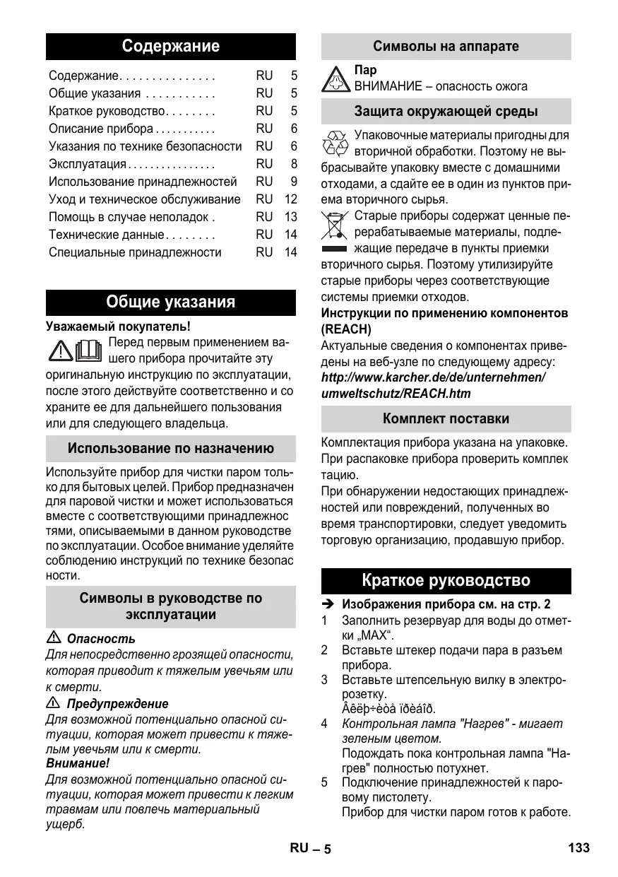 ВНИМАНИЕ – опасность ожога Защита окружающей среды Упаковочные материалы пригодны для вторичной обработки. Поэтому не выбрасывайте упаковку вместе с домашними отходами, а сдайте ее в один из пунктов приема вторичного сырья. Старые приборы содержат ценные перерабатываемые материалы, подлежащие передаче в пункты приемки вторичного сырья. Поэтому утилизируйте старые приборы через соответствующие системы приемки отходов. Инструкции по применению компонентов (REACH) Актуальные сведения о компонентах приведены на веб-узле по следующему адресу: http://www.karcher.de/de/unternehmen/ umweltschutz/REACH.htm Комплект поставки Комплектация прибора указана на упаковке. При распаковке прибора проверить комплек При обнаружении недостающих принадлежностей или повреждений, полученных во время транспортировки, следует уведомить торговую организацию, продавшую прибор. Краткое руководство Î Изображения прибора см. на стр. 2 1 Заполнить резервуар для воды до отметки „MAX“. 2 Вставьте штекер подачи пара в разъем 3 Вставьте штепсельную вилку в электророзетку. Âêëþ÷èòå ïðèáîð. 4 Контрольная лампа "Нагрев" - мигает зеленым цветом. Подождать пока контрольная лампа "Нагрев" полностью потухнет. 5 Подключение принадлежностей к паровому пистолету. Прибор для чистки паром готов к работе. RU – 5