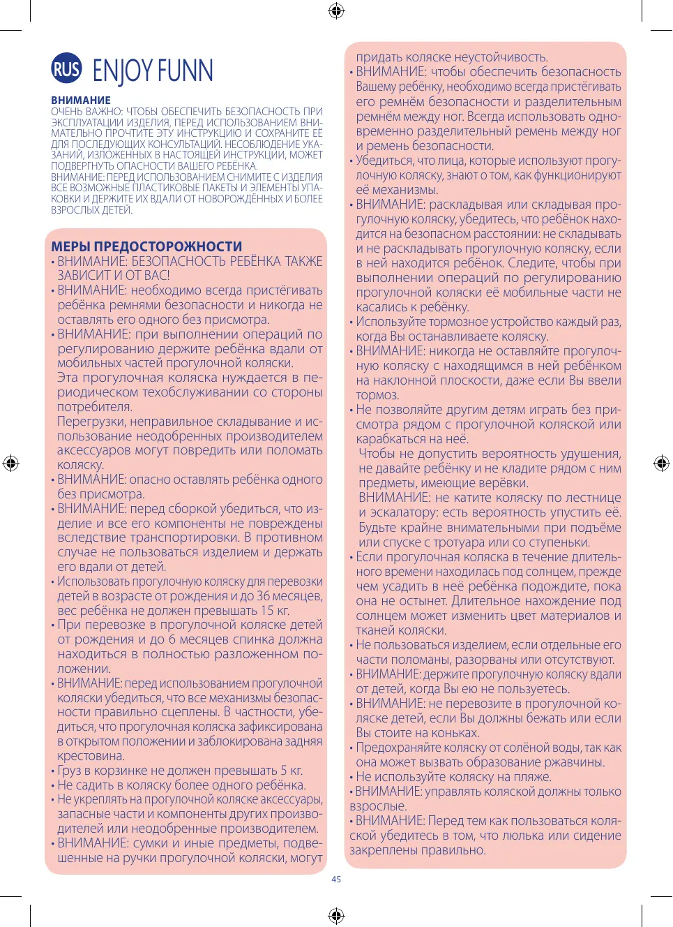 ОЧЕНЬ ВАЖНО: ЧТОБЫ ОБЕСПЕЧИТЬ БЕЗОПАСНОСТЬ ПРИ ЭКСПЛУАТАЦИИ ИЗДЕЛИЯ, ПЕРЕД ИСПОЛЬЗОВАНИЕМ ВНИМАТЕЛЬНО ПРОЧТИТЕ ЭТУ ИНСТРУКЦИЮ И СОХРАНИТЕ ЕЁ ДЛЯ ПОСЛЕДУЮЩИХ КОНСУЛЬТАЦИЙ. НЕСОБЛЮДЕНИЕ УКАЗАНИЙ, ИЗЛОЖЕННЫХ В НАСТОЯЩЕЙ ИНСТРУКЦИИ, МОЖЕТ ПОДВЕРГНУТЬ ОПАСНОСТИ ВАШЕГО РЕБЁНКА. ВНИМАНИЕ: ПЕРЕД ИСПОЛЬЗОВАНИЕМ СНИМИТЕ С ИЗДЕЛИЯ ВСЕ ВОЗМОЖНЫЕ ПЛАСТИКОВЫЕ ПАКЕТЫ И ЭЛЕМЕНТЫ УПАКОВКИ И ДЕРЖИТЕ ИХ ВДАЛИ ОТ НОВОРОЖДЁННЫХ И БОЛЕЕ ВЗРОСЛЫХ ДЕТЕЙ. МЕРЫ ПРЕДОСТОРОЖНОСТИ