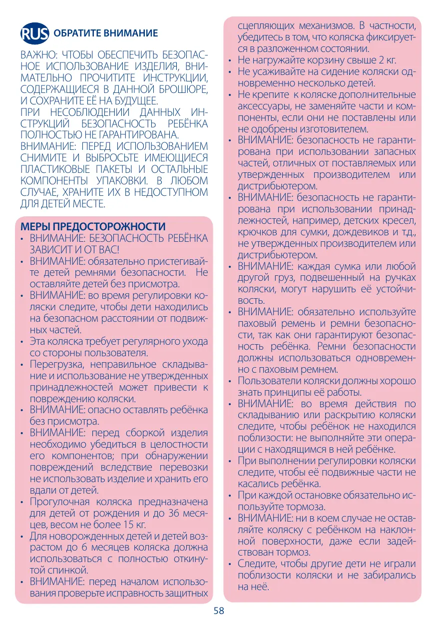 • Pour éviter tout risque d’étranglement, ne pas donner à l’enfant et ne pas placer près de lui des objets munis de cordes. AVERTISSEMENTS: ne pas utiliser la poussette dans les escaliers ou sur un escalator afin de ne pas perdre soudainement le contrôle. Faire ATTENTION lors de la montée et de la descente d’une marche ou d’un trottoir. Si vous laissez la poussette au soleil trop longtemps, attendez qu’elle refroidisse avant d’y mettre l’enfant. L’exposition prolongée au soleil peut entraîner des changements de couleur au niveau des matériaux et des tissus. Ne pas utiliser le produit si certaines parties sont abîmées, arrachées ou absentes. AVERTISSEMENTS: Vérifier que les dispositifs de fixation de la nacelle ou du siège soient correctement enclenchés avant usage AVERTISSEMENTS: quand elle n’est pas utilisée, la poussette doit être tenue hors de portée des enfants. AVERTISSEMENTS: Ne pas utiliser ce produit en faisant du jogging ou des promenades en rollers. Éviter le contact de la poussette avec l’eau saline pour prévenir la formation de rouille. Ne pas utiliser la poussette à la plage. AVERTISSEMENTS: ce produit doit être utilisé exclusivement par un adulte.