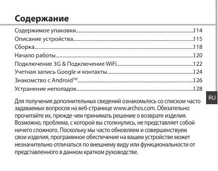 - Устранение неполадок Для получения дополнительных сведений ознакомьтесь со списком часто задаваемых вопросов на веб-странице www.archos.com. Обязательно прочитайте их, прежде чем принимать решение о возврате изделия. Возможно, проблема, с которой вы столкнулись, не представляет собой ничего сложного. Поскольку мы часто обновляем и совершенствуем свои изделия, программное обеспечение на вашем устройстве может незначительно отличаться по внешнему виду или функциональности от представленного в данном кратком руководстве. p. 128