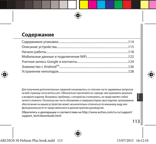 Для получения дополнительных сведений ознакомьтесь со списком часто задаваемых вопросов на веб-странице www.archos.com. Обязательно прочитайте их, прежде чем принимать решение о возврате изделия. Возможно, проблема, с которой вы столкнулись, не представляет собой ничего сложного. Поскольку мы часто обновляем и совершенствуем свои изделия, программное обеспечение на вашем устройстве может незначительно отличаться по внешнему виду или функциональности от представленного в данном кратком руководстве. Обратитесь к декларации о соответствии на http://www.archos.com/ru-ru/support/ support_tech/downloads.html