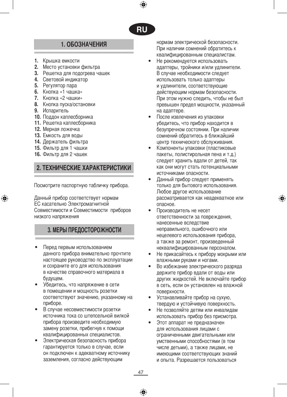 ИСПОЛЬЗОВАНИЮ Перед первым использованием кофеварки промойте мыльной водой фильтры (15 и 16), мерную ложечку (12), емкость для воды (13) и испаритель (9). Хорошо сполосните все детали. Также необходимо прочистить кофеварку изнутри. Для этого наполните емкость (13) водой и выполните цикл приготовления напитка несколько раз, не засыпая в кофеварку кофе.