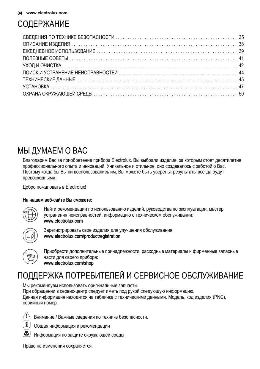 МЫ ДУМАЕМ О ВАС Благодарим Вас за приобретение прибора Electrolux. Вы выбрали изделие, за которым стоят десятилетия профессионального опыта и инноваций. Уникальное и стильное, оно создавалось с заботой о Вас. Поэтому когда бы Вы ни воспользовались им, Вы можете быть уверены: результаты всегда будут превосходными. Добро пожаловать в Electrolux! На нашем веб-сайте Вы сможете: Найти рекомендации по использованию изделий, руководства по эксплуатации, мастер устранения неисправностей, информацию о техническом обслуживании: www.electrolux.com Зарегистрировать свое изделия для улучшения обслуживания: www.electrolux.com/productregistration Приобрести дополнительные принадлежности, расходные материалы и фирменные запасные части для своего прибора: www.electrolux.com/shop