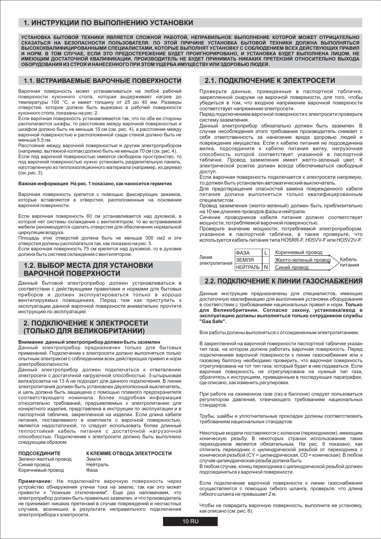 1. ИНСТРУКЦИИ ПО ВЫПОЛНЕНИЮ УСТАНОВКИ УСТАНОВКА БЫТОВОЙ ТЕХНИКИ ЯВЛЯЕТСЯ СЛОЖНОЙ РАБОТОЙ, НЕПРАВИЛЬНОЕ ВЫПОЛНЕНИЕ КОТОРОЙ МОЖЕТ ОТРИЦАТЕЛЬНО СКАЗАТЬСЯ НА БЕЗОПАСНОСТИ ПОЛЬЗОВАТЕЛЯ. ПО ЭТОЙ ПРИЧИНЕ УСТАНОВКА БЫТОВОЙ ТЕХНИКИ ДОЛЖНА ВЫПОЛНЯТЬСЯ ВЫСОКОКВАЛИФИЦИРОВАННЫМИ СПЕЦИАЛИСТАМИ, КОТОРЫЕ ВЫПОЛНЯТ УСТАНОВКУ С СОБЛЮДЕНИЕМ ВСЕХ ДЕЙСТВУЮЩИХ ПРАВИЛ И НОРМ. В ТОМ СЛУЧАЕ, ЕСЛИ ЭТО ПРЕДОСТЕРЕЖЕНИЕ БУДЕТ ПРОИГНОРИРОВАНО, И УСТАНОВКА БУДЕТ ВЫПОЛНЕНА ЛИЦОМ, НЕ ИМЕЮЩИМ ДОСТАТОЧНОЙ КВАЛИФИКАЦИИ, ПРОИЗВОДИТЕЛЬ НЕ БУДЕТ ПРИНИМАТЬ НИКАКИХ ПРЕТЕНЗИЙ ОТНОСИТЕЛЬНО ВЫХОДА ОБОРУДОВАНИЯ ИЗ СТРОЯ И НАНЕСЕННОГО ПРИ ЭТОМ УЩЕРБА ИМУЩЕСТВУ ИЛИ ЗДОРОВЬЮ ЛЮДЕЙ.