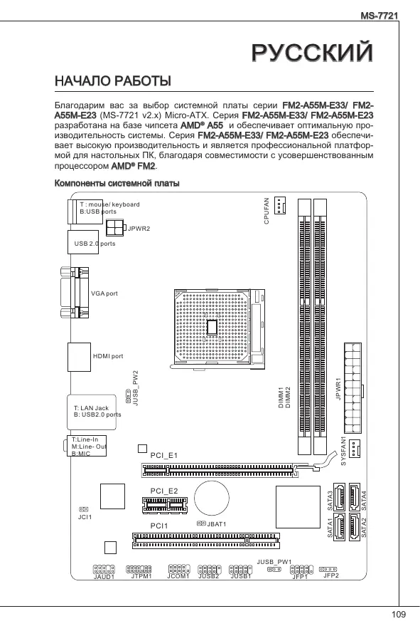 начало работы Благодарим вас за выбор системной платы серии FM2-A55M-E33/ FM2A55M-E23 (MS-7721 v2.x) Micro-ATX. Серия FM2-A55M-E33/ FM2-A55M-E23 разработана на базе чипсета AMD® A55 и обеспечивает оптимальную производительность системы. Серия FM2-A55M-E33/ FM2-A55M-E23 обеспечивает высокую производительность и является профессиональной платформой для настольных ПК, благодаря совместимости с усовершенствованным процессором AMD® FM2. CPUFAN Компоненты системной платы T : mouse/ keyboard B:USB ports JPWR2 USB 2.0 ports VGA port JBAT1 SATA4 PCI1 SATA2 JCI1 JPWR1 SYSFAN1 PCI_E2 SATA3 PCI_E1 SATA1 T:Line-In M:Line- Out B:MIC DIMM1 DIMM2 T: LAN Jack B: USB2.0 ports JUSB_PW2 HDMI port JUSB_PW1 JAUD1 JTPM1 JCOM1 JUSB2 JUSB1 JFP1 JFP2