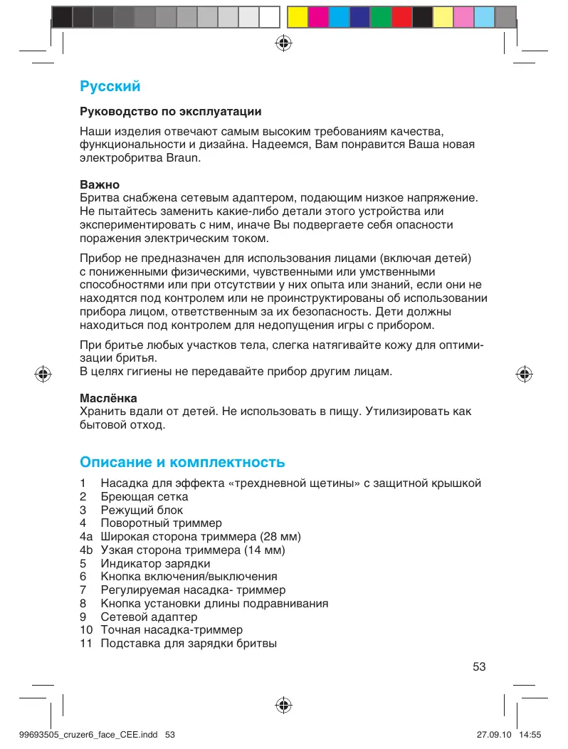 êÛÒÒÍËÈ Руководство по эксплуатации ç‡¯Ë ËÁ‰ÂÎËfl Óڂ˜‡˛Ú Ò‡Ï˚Ï ‚˚ÒÓÍËÏ Ú·ӂ‡ÌËflÏ Í‡˜ÂÒÚ‚‡, ÙÛÌ͈ËÓ̇θÌÓÒÚË Ë ‰ËÁ‡È̇. 燉ÂÂÏÒfl, Ç‡Ï ÔÓ̇‚ËÚÒfl LJ¯‡ ÌÓ‚‡fl ˝ÎÂÍÚÓ·ËÚ‚‡ Braun. Бритва снабжена сетевым адаптером, подающим низкое напряжение. Не пытайтесь заменить какие-либо детали этого устройства или экспериментировать с ним, иначе Вы подвергаете себя опасности поражения электрическим током. Прибор не предназначен для использования лицами (включая детей) с пониженными физическими, чувственными или умственными способностями или при отсутствии у них опыта или знаний, если они не находятся под контролем или не проинструктированы об использовании прибора лицом, ответственным за их безопасность. Дети должны находиться под контролем для недопущения игры с прибором. При бритье любых участков тела, слегка натягивайте кожу для оптимизации бритья. В целях гигиены не передавайте прибор другим лицам. Хранить вдали от детей. Не использовать в пищу. Утилизировать как бытовой отход. Описание и комплектность