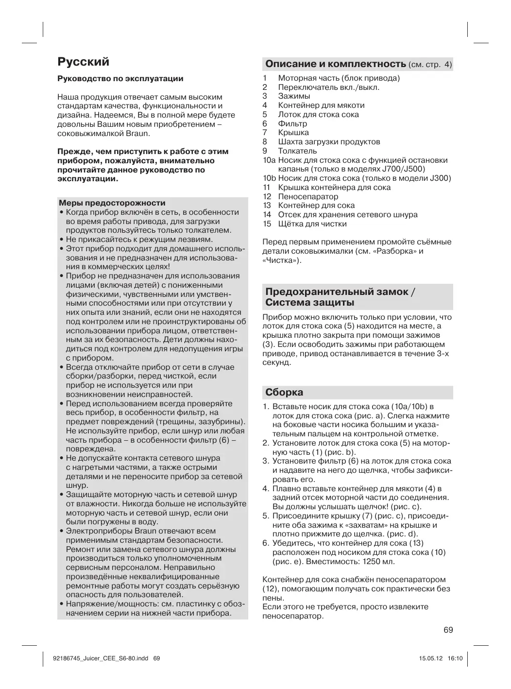 Русский Руководство по эксплуатации Наша продукция отвечает самым высоким стандартам качества, функциональности и дизайна. Надеемся, Вы в полной мере будете довольны Вашим новым приобретением – соковыжималкой Braun. Прежде, чем приступить к работе с этим прибором, пожалуйста, внимательно прочитайте данное руководство по эксплуатации. Меры предосторожности • Когда прибор включён в сеть, в особенности во время работы привода, для загрузки продуктов пользуйтесь только толкателем. • Не прикасайтесь к режущим лезвиям. • Этот прибор подходит для домашнего использования и не предназначен для использования в коммерческих целях! • Прибор не предназначен для использования лицами (включая детей) с пониженными физическими, чувственными или умственными способностями или при отсутствии у них опыта или знаний, если они не находятся под контролем или не проинструктированы об использовании прибора лицом, ответственным за их безопасность. Дети должны находиться под контролем для недопущения игры с прибором. • Всегда отключайте прибор от сети в случае сборки/разборки, перед чисткой, если прибор не используется или при возникновении неисправностей. • Перед использованием всегда проверяйте весь прибор, в особенности фильтр, на предмет повреждений (трещины, зазубрины). Не используйте прибор, если шнур или любая часть прибора – в особенности фильтр (6) – повреждена. • Не допускайте контакта сетевого шнура с нагретыми частями, а также острыми деталями и не переносите прибор за сетевой шнур. • Защищайте моторную часть и сетевой шнур от влажности. Никогда больше не используйте моторную часть и сетевой шнур, если они были погружены в воду. • Электроприборы Braun отвечают всем применимым стандартам безопасности. Ремонт или замена сетевого шнура должны производиться только уполномоченным сервисным персоналом. Неправильно произведённые неквалифицированные ремонтные работы могут создать серьёзную опасность для пользователей. • Напряжение/мощность: см. пластинку с обозначением серии на нижней части прибора.