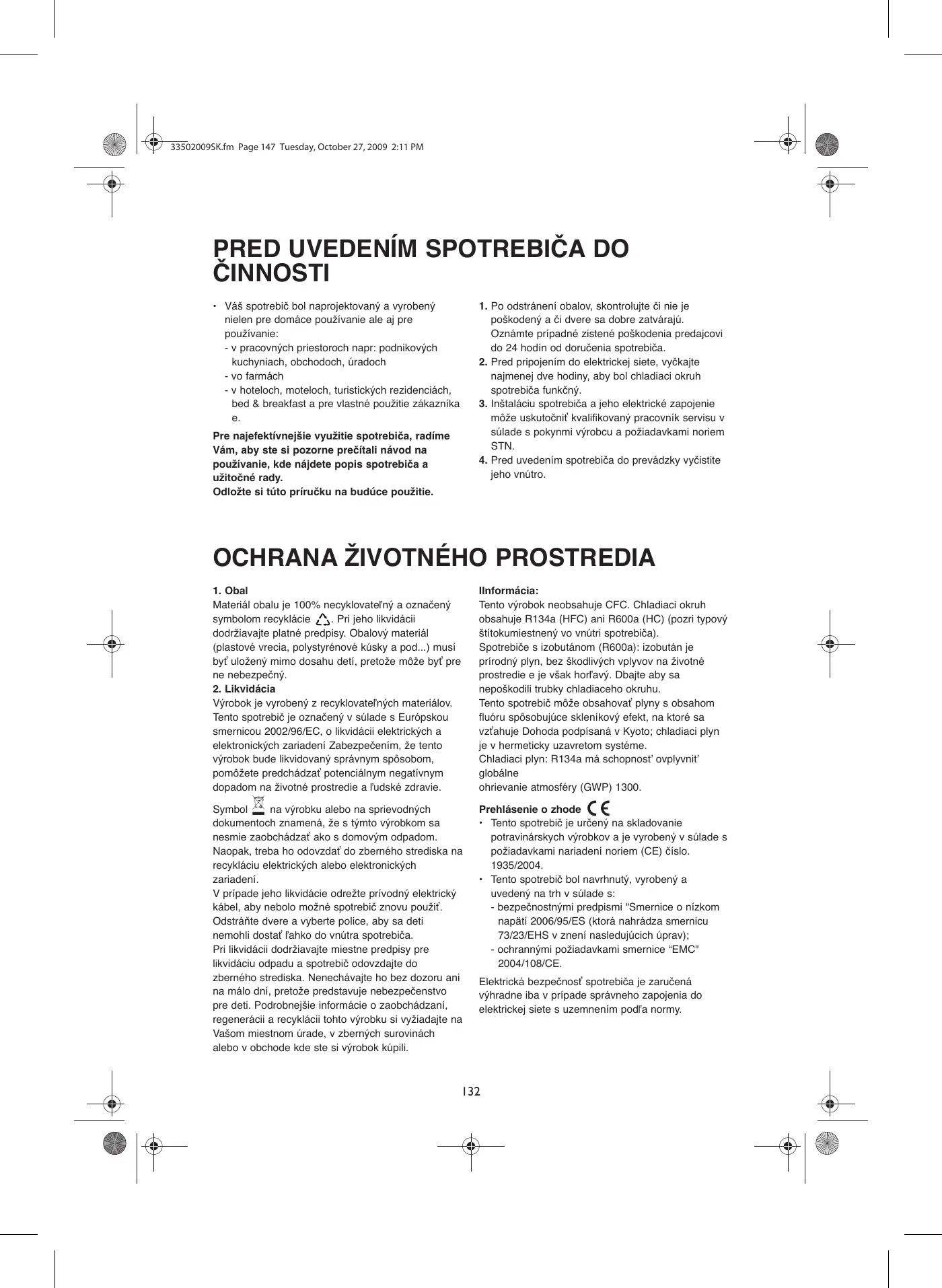 Výrobok je vyrobený z recyklovateľných materiálov. Tento spotrebič je označený v súlade s Európskou smernicou 2002/96/EC, o likvidácii elektrických a elektronických zariadení Zabezpečením, že tento výrobok bude likvidovaný správnym spôsobom, pomôžete predchádzať potenciálnym negatívnym dopadom na životné prostredie a ľudské zdravie. IInformácia: Tento výrobok neobsahuje CFC. Chladiaci okruh obsahuje R134a (HFC) ani R600a (HC) (pozri typový štítokumiestnený vo vnútri spotrebiča). Spotrebiče s izobutánom (R600a): izobután je prírodný plyn, bez škodlivých vplyvov na životné prostredie e je však horľavý. Dbajte aby sa nepoškodili trubky chladiaceho okruhu. Tento spotrebič môže obsahovať plyny s obsahom fluóru spôsobujúce skleníkový efekt, na ktoré sa vzťahuje Dohoda podpísaná v Kyoto; chladiaci plyn je v hermeticky uzavretom systéme. Chladiaci plyn: R134a má schopnost’ ovplyvnit’ globálne ohrievanie atmosféry (GWP) 1300. Symbol na výrobku alebo na sprievodných dokumentoch znamená, že s týmto výrobkom sa nesmie zaobchádzať ako s domovým odpadom. Naopak, treba ho odovzdať do zberného strediska na recykláciu elektrických alebo elektronických zariadení. V prípade jeho likvidácie odrežte prívodný elektrický kábel, aby nebolo možné spotrebič znovu použiť. Odstráňte dvere a vyberte police, aby sa deti nemohli dostať ľahko do vnútra spotrebiča. Pri likvidácii dodržiavajte miestne predpisy pre likvidáciu odpadu a spotrebič odovzdajte do zberného strediska. Nenechávajte ho bez dozoru ani na málo dní, pretože predstavuje nebezpečenstvo pre deti. Podrobnejšie informácie o zaobchádzaní, regenerácii a recyklácii tohto výrobku si vyžiadajte na Vašom miestnom úrade, v zberných surovinách alebo v obchode kde ste si výrobok kúpili. Prehlásenie o zhode