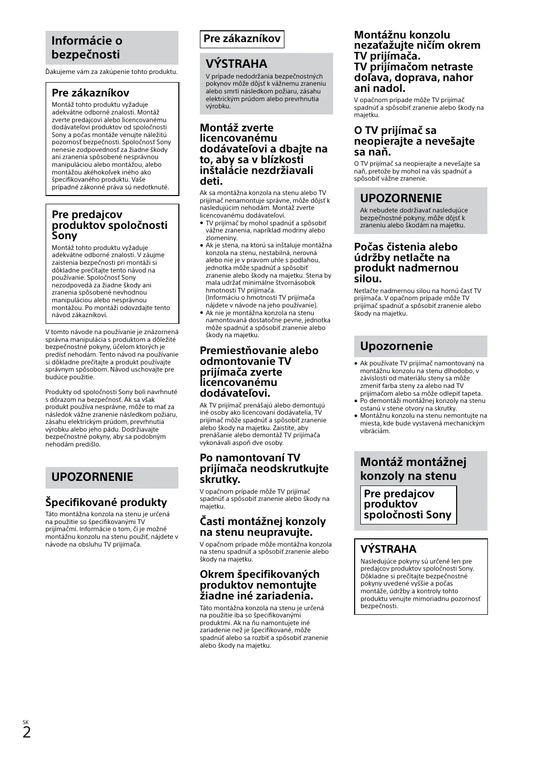 Téléchargez la notice de votre Nástenný držiak na TV au format PDF gratuitement ! Retrouvez votre notice SU-WL450 - SONY et reprennez votre appareil électronique en main. Sur cette page sont publiés tous les documents nécessaires à l'utilisation de votre appareil SU-WL450 de la marque SONY.