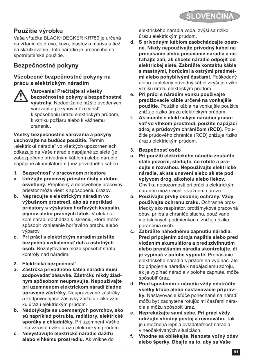 SLOVENČINA Použitie výrobku Vaša vŕtačka BLACK+DECKER KR750 je určená na vŕtanie do dreva, kovu, plastov a muriva a tiež na skrutkovanie. Toto náradie je určené iba na spotrebiteľské použitie.