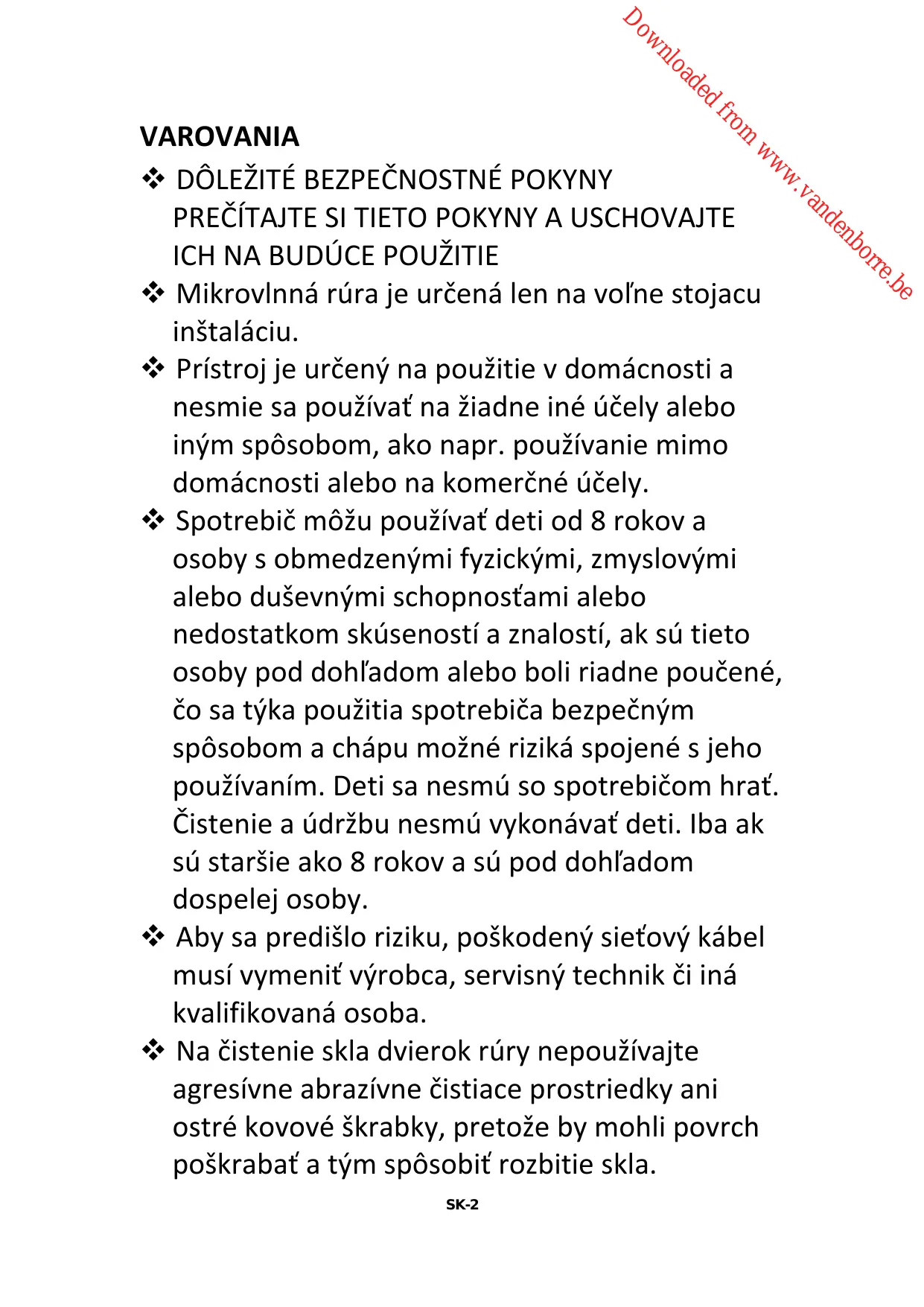 Mikrovlnná rúra je určená len na voľne stojacu inštaláciu. Prístroj je určený na použitie v domácnosti a nesmie sa používať na žiadne iné účely alebo iným spôsobom, ako napr. používanie mimo domácnosti alebo na komerčné účely. Spotrebič môžu používať deti od 8 rokov a osoby s obmedzenými fyzickými, zmyslovými alebo duševnými schopnosťami alebo nedostatkom skúseností a znalostí, ak sú tieto osoby pod dohľadom alebo boli riadne poučené, čo sa týka použitia spotrebiča bezpečným spôsobom a chápu možné riziká spojené s jeho používaním. Deti sa nesmú so spotrebičom hrať. Čistenie a údržbu nesmú vykonávať deti. Iba ak sú staršie ako 8 rokov a sú pod dohľadom dospelej osoby. Aby sa predišlo riziku, poškodený sieťový kábel musí vymeniť výrobca, servisný technik či iná kvalifikovaná osoba. Na čistenie skla dvierok rúry nepoužívajte agresívne abrazívne čistiace prostriedky ani ostré kovové škrabky, pretože by mohli povrch poškrabať a tým spôsobiť rozbitie skla.