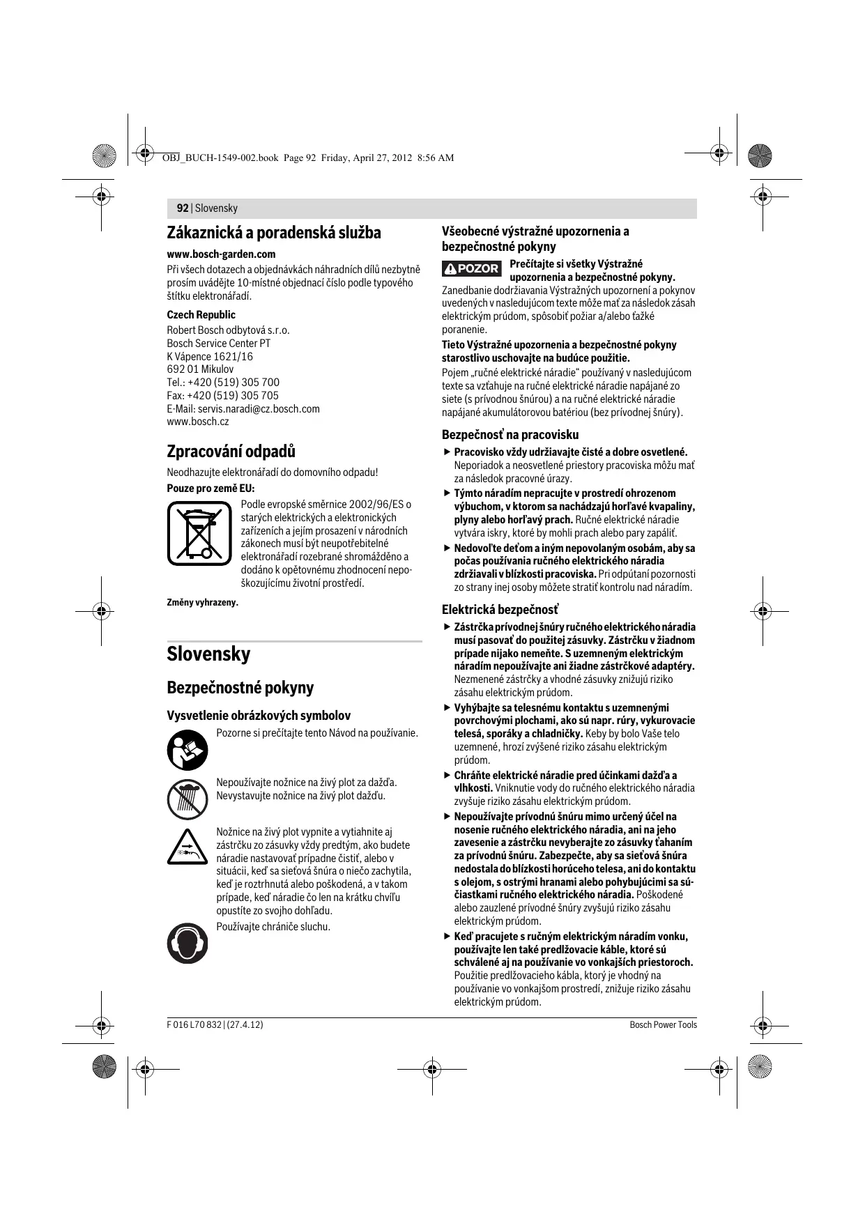 Úroveň kmitov uvedená v týchto pokynoch bola nameraná podľa meracieho postupu uvedeného v norme EN 60745 a možno ju používať na vzájomné porovnávanie rôznych typov ručného elektrického náradia medzi sebou. Hodí sa aj na predbežný odhad zaťaženia vibráciami. F 016 L70 832 | (27.4.12)