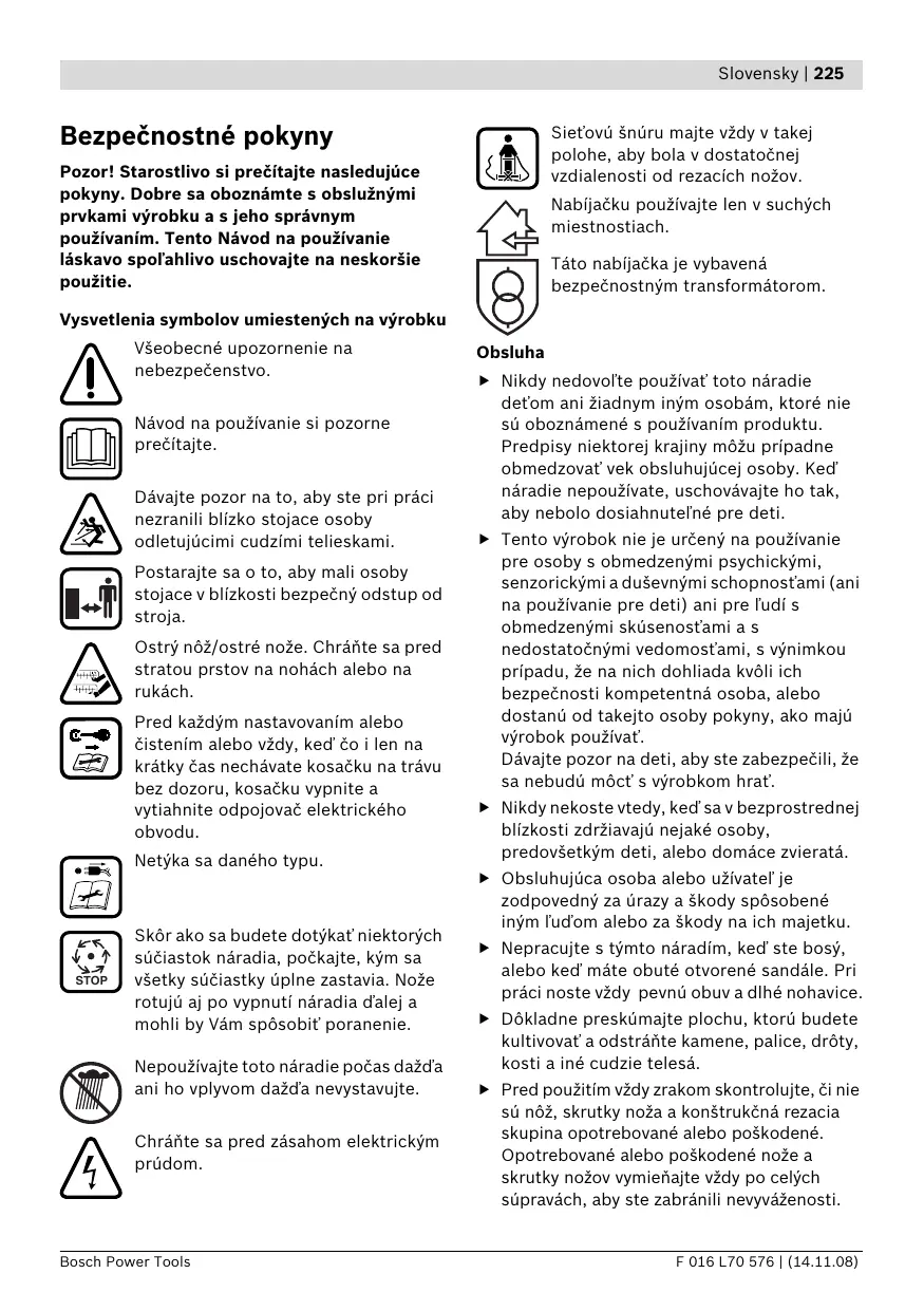 Pozor! Starostlivo si prečítajte nasledujúce pokyny. Dobre sa oboznámte s obslužnými prvkami výrobku a s jeho správnym používaním. Tento Návod na používanie láskavo spoľahlivo uschovajte na neskoršie použitie. Nabíjačku používajte len v suchých miestnostiach. Táto nabíjačka je vybavená bezpečnostným transformátorom. Vysvetlenia symbolov umiestených na výrobku Všeobecné upozornenie na nebezpečenstvo. Návod na používanie si pozorne prečítajte. Dávajte pozor na to, aby ste pri práci nezranili blízko stojace osoby odletujúcimi cudzími telieskami. Postarajte sa o to, aby mali osoby stojace v blízkosti bezpečný odstup od stroja. Ostrý nôž/ostré nože. Chráňte sa pred stratou prstov na nohách alebo na rukách. Pred každým nastavovaním alebo čistením alebo vždy, keď čo i len na krátky čas nechávate kosačku na trávu bez dozoru, kosačku vypnite a vytiahnite odpojovač elektrického obvodu. Netýka sa daného typu. STOP Skôr ako sa budete dotýkať niektorých súčiastok náradia, počkajte, kým sa všetky súčiastky úplne zastavia. Nože rotujú aj po vypnutí náradia ďalej a mohli by Vám spôsobiť poranenie. Nepoužívajte toto náradie počas dažďa ani ho vplyvom dažďa nevystavujte. Chráňte sa pred zásahom elektrickým prúdom. Bosch Power Tools Obsluha f Nikdy nedovoľte používať toto náradie deťom ani žiadnym iným osobám, ktoré nie sú oboznámené s používaním produktu. Predpisy niektorej krajiny môžu prípadne obmedzovať vek obsluhujúcej osoby. Keď náradie nepoužívate, uschovávajte ho tak, aby nebolo dosiahnuteľné pre deti. f Tento výrobok nie je určený na používanie pre osoby s obmedzenými psychickými, senzorickými a duševnými schopnosťami (ani na používanie pre deti) ani pre ľudí s obmedzenými skúsenosťami a s nedostatočnými vedomosťami, s výnimkou prípadu, že na nich dohliada kvôli ich bezpečnosti kompetentná osoba, alebo dostanú od takejto osoby pokyny, ako majú výrobok používať. Dávajte pozor na deti, aby ste zabezpečili, že sa nebudú môcť s výrobkom hrať. f Nikdy nekoste vtedy, keď sa v bezprostrednej blízkosti zdržiavajú nejaké osoby, predovšetkým deti, alebo domáce zvieratá. f Obsluhujúca osoba alebo užívateľ je zodpovedný za úrazy a škody spôsobené iným ľuďom alebo za škody na ich majetku. f Nepracujte s týmto náradím, keď ste bosý, alebo keď máte obuté otvorené sandále. Pri práci noste vždy pevnú obuv a dlhé nohavice. f Dôkladne preskúmajte plochu, ktorú budete kultivovať a odstráňte kamene, palice, drôty, kosti a iné cudzie telesá. f Pred použitím vždy zrakom skontrolujte, či nie sú nôž, skrutky noža a konštrukčná rezacia skupina opotrebované alebo poškodené. Opotrebované alebo poškodené nože a skrutky nožov vymieňajte vždy po celých súpravách, aby ste zabránili nevyváženosti. F 016 L70 576 | (14.11.08) 226 | Slovensky f Pracujte iba za denného svetla alebo za dobrého umelého osvetlenia. f Podľa možnosti nepoužívajte náradie vtedy, keď je tráva mokrá. f Kráčajte vždy pokojne, nikdy rýchlo nebežte. f Náradie sa zásadne nesmie používať s poškodenými ochrannými prvkami, krytmi alebo bez bezpečnostných zariadení, ako sú napríklad ochranný kryt a/alebo zberací kôš na trávu. f Práca na svahu môže byť nebezpečná. – Nekoste žiadne príliš strmé svahy. – Na šikmých plochách alebo na mokrej tráve dávajte vždy pozor na bezpečnú chôdzu. – Na šikmých plochách vždy postupujte pri kosení priečne, nikdy nie smerom hore a smerom dole. – Mimoriadne opatrne postupujte pri zmene smeru na svahoch. f Mimoriadnu opatrnosť zachovávajte pri chôdzi dozadu alebo pri ťahaní náradia smerom dozadu. f Pri kosení trávnika posúvajte náradie vždy smerom dopredu a nikdy ho neťahajte smerom k svojmu telu. f Nože musia byť vždy zastavené, keď potrebujete náradie preklopiť pri transporte, keď prechádzate krížom cez plochy, ktoré nie sú zarastené trávou, a keď plánujete stroj prepraviť na inú plochu, ktorú chcete pokosiť, a takisto aj späť. f Náradie pri štartovaní alebo pri spúšťaní motora nepreklápajte, s výnimkou prípadu, ak je to potrebné na spustenie vo vysokej tráve. V takomto prípade stranu odvrátenú od obsluhy nenadvihujte stáčaním rukoväte viac, ako je bezpodmienečne potrebné. Dávajte pozor na to, aby ste mali ruky položené na rukoväti, keď náradie opätovne uvádzate do činnosti. f Zapnite stroj podľa popisu v Návode na používanie a dávajte pozor na to, aby ste mali chodidlá v dostatočnej vzdialenosti od rotujúcich súčiastok. f Nedávajte svoje ruky ani chodidlá do blízkosti rotujúcich súčiastok ani pod ne. F 016 L70 576 | (14.11.08) f Keď budete pracovať s náradím, buďte vždy v dostatočnej vzdialenosť od vyhadzovacej zóny. f Nikdy náradie nezdvíhajte ani neprenášajte vtedy, keď motor beží. Uvoľnenie odpojovača elektrického obvodu: – vždy vtedy, keď sa potrebujete vzdialiť od náradia, – keď chcete odstrániť blokovanie (blokujúce nečistoty), – keď budete stroj kontrolovať, čistiť, alebo na ňom budete vykonávať inú prácu, – a takisto po každej kolízii s cudzím telesom. Ihneď náradie prekontrolujte, či nie je poškodené, a v tom prípade, ak začne stroj nezvyčajne vibrovať, – okamžite ho prekontrolujte a prípadne ho dajte opraviť. Údržba f Postarajte sa o to, aby boli všetky matice, zavŕtané skrutky a ostatné skrutky dobre utiahnuté, aby bol zabezpečený správny prevádzkový stav náradia. f Pravidelne kontrolujte stav a opotrebovanie zberacieho kôša na trávu. f Kontrolujte pravidelne výrobok a keď zistíte, že niektoré súčiastky sú opotrebované alebo poškodené, preventívne ich kvôli vlastnej bezpečnosti vymeňte. f Používajte výlučne rezacie nože, ktoré sú urče