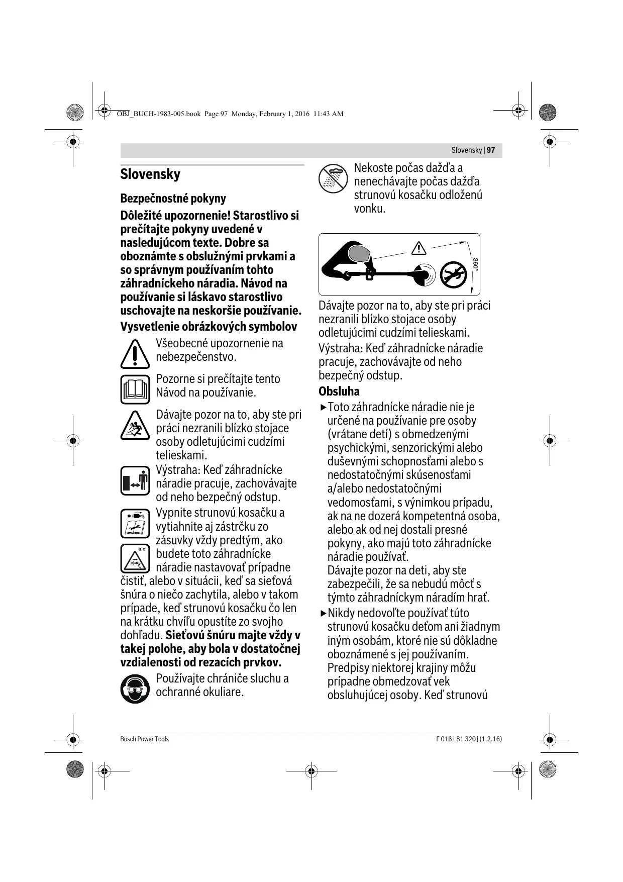 F 016 L81 320 | (1.2.16) OBJ_BUCH-1983-005.book Page 96 Monday, February 1, 2016 11:43 AM 96 | Česky Hledání závad Příznaky Sekačka neběží Sekačka běží přerušovaně Možná příčina Náprava Chybí síťové napětí Zkontrolujte a zapněte Vadná síťová zásuvka Použijte jinou zásuvku Poškozený prodlužovací kabel Kabel zkontrolujte a vyměňte, je-li poškozený Poškozený prodlužovací kabel Kabel zkontrolujte a vyměňte, je-li poškozený Vyhledejte servis Vadná vnitřní kabeláž zahradního nářadí Vyhledejte servis Přetížené zahradní nářadí Příliš vysoká tráva Sečte stupňovitě Zahradní nářadí neseče Příliš krátké/ulomené střižné prvky Zkontrolujte cívku a příp. ji vyměňte Střižná struna se nenavádí Prázdná strunová cívka Cívku vyměňte Střižná struna je v cívce zamotaná Zkontrolujte cívku se strunou a příp. cívku vyměňte Střižná struna je v cívce zamotaná Zkontrolujte cívku se strunou a příp. cívku vyměňte Nesprávné zacházení se sekačkou Sečte pouze hrotem střižné struny; vyhněte se dotyku s kameny, stěnami a jinými pevnými předměty. Střižnou strunu pravidelně navádějte, aby se využíval celý střižný průměr. Střižná struna se stále láme Zákaznická a poradenská služba Zpracování odpadů www.bosch-garden.com Při všech dotazech a objednávkách náhradních dílů nezbytně prosím uvádějte 10-místné objednací číslo podle typového štítku zahradního nářadí. Elektronářadí, příslušenství a obaly by měly být dodány k opětovnému zhodnocení nepoškozujícímu životní prostředí. Nevyhazujte zahradní nářadí do domovního odpadu! Pouze pro země EU: Podle evropské směrnice 2012/19/EU o starých elektrických a elektronických zařízeních a jejím prosazení v národních zákonech musejí být neupotřebitelná elektrická a elektronická zařízení rozebraná shromážděna a dodána k opětovnému zhodnocení nepoškozujícímu životní prostředí. Czech Republic Robert Bosch odbytová s.r.o. Bosch Service Center PT K Vápence 1621/16 692 01 Mikulov Na www.bosch-pt.cz si si můžete objednat opravu Vašeho stroje nebo náhradní díly online. Tel.: 519 305700 Fax: 519 305705 E-Mail: servis.naradi@cz.bosch.com www.bosch.cz F 016 L81 320 | (1.2.16) Změny vyhrazeny. Bosch Power Tools OBJ_BUCH-1983-005.book Page 97 Monday, February 1, 2016 11:43 AM Slovensky | 97 Slovensky Bezpečnostné pokyny Dôležité upozornenie! Starostlivo si prečítajte pokyny uvedené v nasledujúcom texte. Dobre sa oboznámte s obslužnými prvkami a so správnym používaním tohto záhradníckeho náradia. Návod na používanie si láskavo starostlivo uschovajte na neskoršie používanie. Vysvetlenie obrázkových symbolov Všeobecné upozornenie na nebezpečenstvo. Pozorne si prečítajte tento Návod na používanie. Dávajte pozor na to, aby ste pri práci nezranili blízko stojace osoby odletujúcimi cudzími telieskami. Výstraha: Keď záhradnícke náradie pracuje, zachovávajte od neho bezpečný odstup. Vypnite strunovú kosačku a vytiahnite aj zástrčku zo zásuvky vždy predtým, ako budete toto záhradnícke náradie nastavovať prípadne čistiť, alebo v situácii, keď sa sieťová šnúra o niečo zachytila, alebo v takom prípade, keď strunovú kosačku čo len na krátku chvíľu opustíte zo svojho dohľadu. Sieťovú šnúru majte vždy v takej polohe, aby bola v dostatočnej vzdialenosti od rezacích prvkov. Používajte chrániče sluchu a ochranné okuliare. Bosch Power Tools Nekoste počas dažďa a nenechávajte počas dažďa strunovú kosačku odloženú vonku. Dávajte pozor na to, aby ste pri práci nezranili blízko stojace osoby odletujúcimi cudzími telieskami. Výstraha: Keď záhradnícke náradie pracuje, zachovávajte od neho bezpečný odstup. Obsluha Toto záhradnícke náradie nie je určené na používanie pre osoby (vrátane detí) s obmedzenými psychickými, senzorickými alebo duševnými schopnosťami alebo s nedostatočnými skúsenosťami a/alebo nedostatočnými vedomosťami, s výnimkou prípadu, ak na ne dozerá kompetentná osoba, alebo ak od nej dostali presné pokyny, ako majú toto záhradnícke náradie používať. Dávajte pozor na deti, aby ste zabezpečili, že sa nebudú môcť s týmto záhradníckym náradím hrať. Nikdy nedovoľte používať túto strunovú kosačku deťom ani žiadnym iným osobám, ktoré nie sú dôkladne oboznámené s jej používaním. Predpisy niektorej krajiny môžu prípadne obmedzovať vek obsluhujúcej osoby. Keď strunovú F 016 L81 320 | (1.2.16) OBJ_BUCH-1983-005.book Page 98 Monday, February 1, 2016 11:43 AM 98 | Slovensky kosačku nepoužívate, uschovávajte ju tak, aby nebola dosiahnuteľná pre deti. Nikdy nepoužívajte strunovú kosačku, ktorá vôbec nemá, alebo má poškodené kryty či ochranné prvky, alebo tieto nie sú správne umiestnené. Pred použitím skontrolujte sieťovú šnúru a predlžovaciu šnúru, či nie je poškodená alebo nevykazuje príznaky starnutia. Keď sa počas používania poškodí sieťová šnúra, okamžite vytiahnite zástrčku sieťovej šnúry zo zásuvky. NEDOTÝKAJTE SA SIEŤOVEJ ŠNÚRY SKÔR, AKO JU ODPOJÍTE ZO ZÁSUVKY. Nepoužívajte túto strunovú kosačku v takom prípade, keď je prívodná šnúra poškodená alebo opotrebovaná. Ak je potrebná výmena prívodnej šnúry, musí ju vykonať výrobca, jeho niektoré autorizované servisné stredisko ručného elektrického náradia alebo určená osoba s príslušnou kvalifikáciou, aby sa zabránilo ohrozeniu bezpečnosti používateľa. Zabezpečte, aby sa predlžovacia šnúra nedostala do blízkosti rezacích elementov. Skontrolujte záhradnícke náradie pred použitím a v prípade pádu alebo úderu, či nie je opotrebované alebo poškodené a pred ďalším používaním ho prípadne dajte opraviť. Nepracujte so z