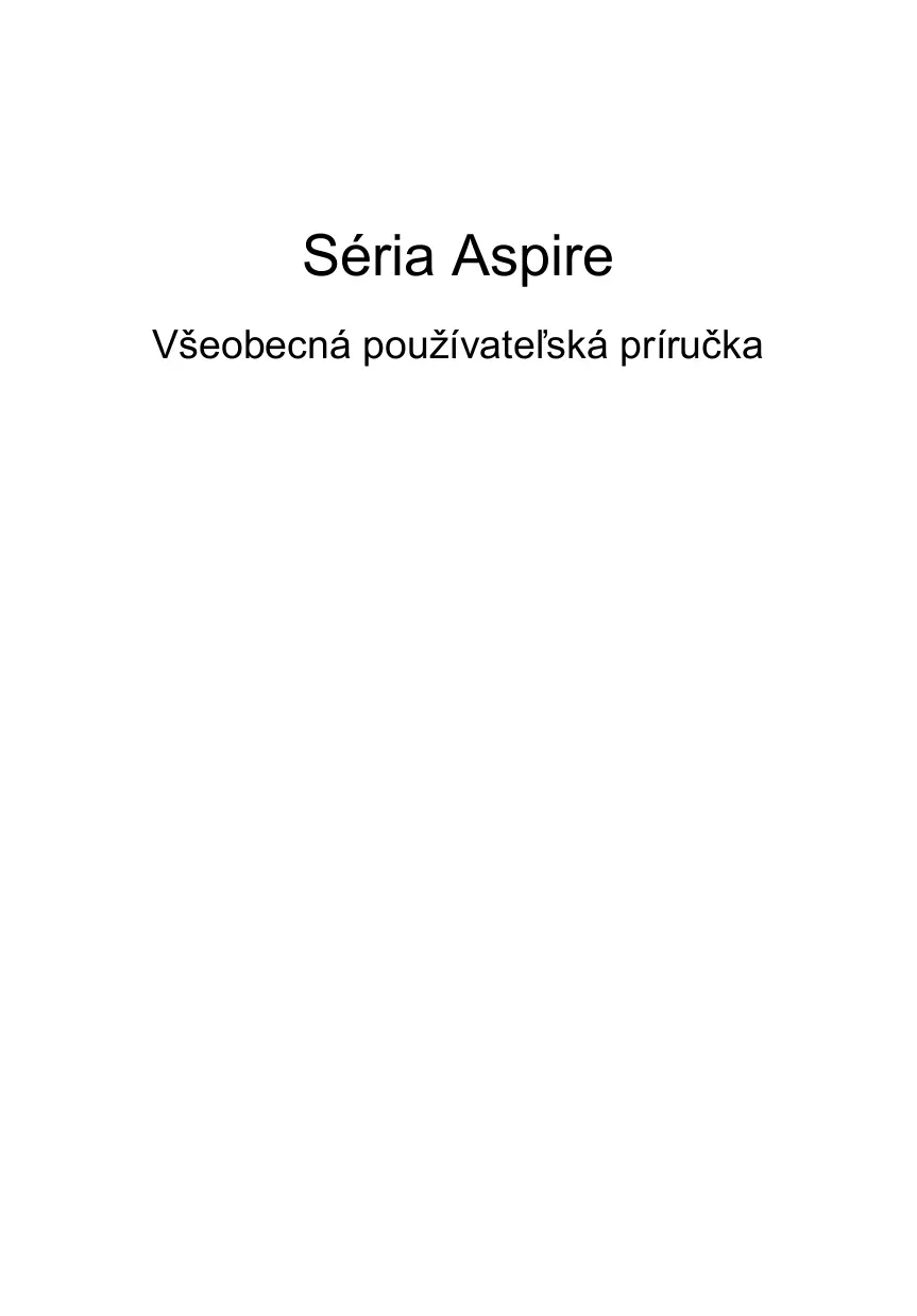 Urobte niekoľko strečingových cvičení. Ak je to možné, častejšie sa nadýchajte čistého vzduchu. Pravidelne cvičte a udržiavajte svoje telo zdravé. Pozor! Neodporúčame vám používat’ počítač na pohovke alebo v posteli. Ak to nie je nevyhnutné, pracujte len v krátkych časových intervaloch, pravidelne si doprajte prestávku a strečingové cvičenia. Poznámka: Ďalšie informácie nájdete v časti "Predpisy a poznámky o bezpečnosti" na strane 45. xiii Hneď na úvod Radi by sme vám poďakovali za rozvoj prenosných počítačov série Acer - vašej voľby pre vaše mobilné počítačové potreby. Vaše príručky Aby sme vám pomohli s používaním Acer, vytvorili sme pre vás sadu príručiek: V prvom rade plagát Quick start up guide..., ktorý vám pomôže začat’ s nastavením vášho počítača. Všeobecná používateľská príručka pre sériu Aspire obsahuje užitočné informácie týkajúce sa všetkých modelov v produktovom rade Aspire. Obsahuje základné témy, ako napríklad informácie o aplikácii Acer eRecovery Management, používaní klávesnice, zvuku atď. Majte teda na pamäti, že Všeobecná používateľská príručka ako aj AcerSystem User Guide, ktorá je spomenutá ďalej, občas obsahujú informácie o funkciách a vlastnostiach, ktorými sú vybavené iba určité modely produktovej série a model, ktorý si zakúpili, nimi nemusí byt’ vybavený. Opis takýchto funkcií je v texte označený poznámkou v zmysle "len pre určité modely". Informácie o tom, ako vám počítač pomôže byt’ produktívnejší, nájdete v AcerSystem User Guide. Táto príručka obsahuje podrobné informácie o systémových programoch, obnove dát, možnostiach rozšírenia a riešenie problémov. Okrem toho obsahuje informácie o záruke a všeobecné vyhlásenia k predpisom a bezpečnosti. Je dostupná vo formáte PDF a je umiestnená vo vašom prenosnom počítači. Ak si chcete pozriet’ jej obsah, postupujte podľa nasledovných krokov: 1 Kliknite na Štart > Všetky programy > AcerSystem. 2 Kliknite na AcerSystem User Guide. Poznámka: Prezeranie súboru vyžaduje Adobe Reader. Ak na vašom počítači nie je Adobe Reader nainštalovaný, kliknutím na AcerSystem User Guide sa najprv spustí inštalácia programu Adobe Reader. Inštaláciu dokončíte podľa inštrukcií, ktoré uvidíte na obrazovke. Inštrukcie ako používat’ Adobe Reader nájdete v menu Pomocník a Podpora. xiv Základy starostlivosti a tipy na používanie počítača Zapnutie a vypnutie počítača Ak chcete zapnút’ počítač, jednoducho stlačte a pust’te tlačidlo Power, ktoré sa nachádza pod LCD obrazovkou. Umiestnenie tlačidla Power si pozrite v "Quick start up guide". Ak chcete počítač vypnút’, použite jeden z týchto spôsobov: