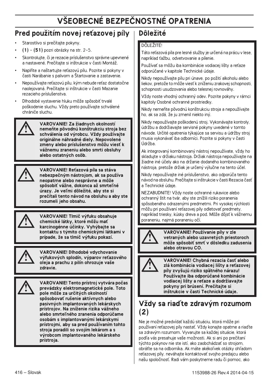 VAROVANIE! PouÏívanie píly v zle vetran˘ch alebo uzavret˘ch priestoroch môÏe spôsobiÈ smrÈ v dôsledku zadusenia alebo otravou CO. VAROVANIE! Chybná rezacia ãasÈ alebo zlá kombinácia vodiacej li‰ty a reÈazovej píly zvy‰ujú riziko spätného nárazu! PouÏívajte iba odporúãané kombinácie vodiacej li‰ty a reÈaze a dodrÏiavajte pokyny pri brúsení. Preãítajte si in‰trukcie v ãasti Technické údaje. VÏdy sa riaìte zdrav˘m rozumom (2) Nie je moÏné predvídaÈ kaÏdú situáciu, ktorá môÏe pri pouÏívaní reÈazovej píly nastaÈ. VÏdy konajte opatrne a riaìte sa zdrav˘m rozumom. Vyvarujte sa kaÏdej situácie, ktorá podºa vás presahuje va‰e moÏnosti. Ak si ani po preãítaní t˘chto pokynov nie ste istí, ako zaobchádzaÈ so strojom, obráÈte sa na odborníka. Ak máte akékoºvek otázky ohºadom reÈazovej píly, neváhajte kontaktovaÈ svojho predajcu alebo na‰u spoloãnosÈ. Radi vám poskytneme radu ãi pomoc, ako 1153988-26 Rev.4 2014-04-15 V·EOBECNÉ BEZPEâNOSTNÉ OPATRENIA pouÏívaÈ reÈazovú pílu úãinne a zároveÀ bezpeãne. Ak je to moÏné, prihláste sa do ‰koliaceho kurzu o pouÏívaní reÈazovej píly. Informácie o dostupn˘ch ‰koliacich materiáloch a kurzoch získate u svojho predajcu, v lesníckej ‰kole alebo kniÏnici. Neustále pracujeme na vylep‰ení dizajnu a technológie - na vylep‰eniach, ktoré zvy‰ujú bezpeãnosÈ a v˘konnosÈ. Pravidelne sa informujte u svojho predajcu o novinkách, ktoré môÏete vyuÏiÈ vo svoj prospech.