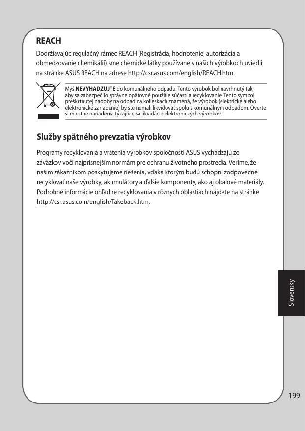 Programy recyklovania a vrátenia výrobkov spoločnosti ASUS vychádzajú zo záväzkov voči najprísnejším normám pre ochranu životného prostredia. Veríme, že našim zákazníkom poskytujeme riešenia, vďaka ktorým budú schopní zodpovedne recyklovať naše výrobky, akumulátory a ďalšie komponenty, ako aj obalové materiály. Podrobné informácie ohľadne recyklovania v rôznych oblastiach nájdete na stránke http://csr.asus.com/english/Takeback.htm.