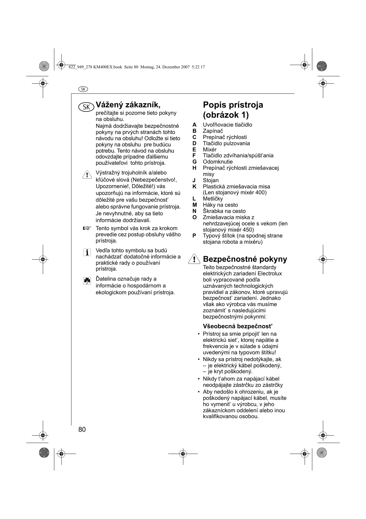 Teito bezpečnostné štandardy elektrických zariadení Electrolux boli vypracované podla uznávaných technologických pravidiel a zákonov, ktoré upravujú bezpečnost' zariadení. Jednako však ako vyrobca vás musíme zoznámít's nasledujúcimi bezpečnostnými pokynmi: