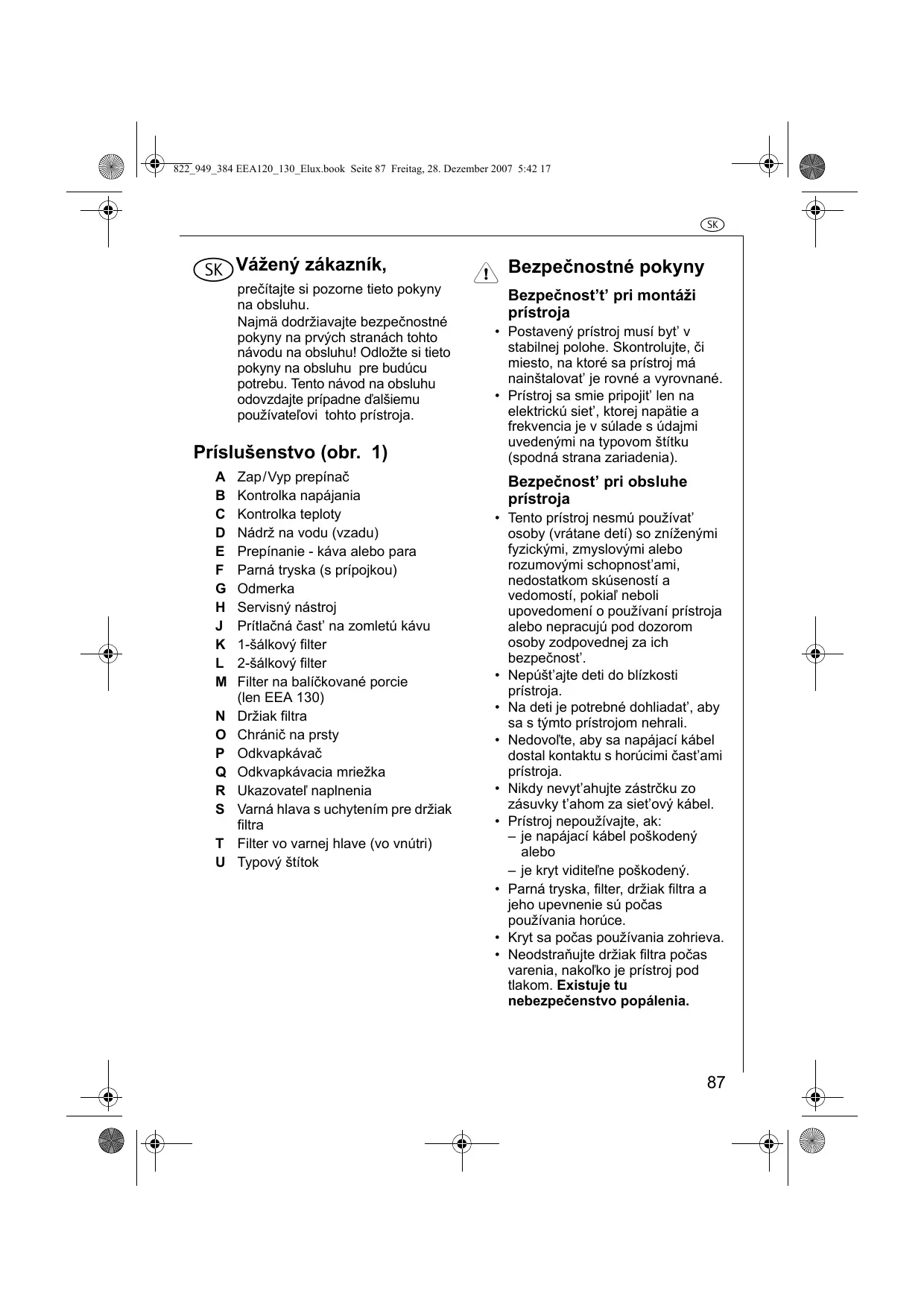 Zap/Vyp prepínač Kontrolka napájania Kontrolka teploty Nádrž na vodu (vzadu) Prepínanie - káva alebo para Parná tryska (s prípojkou) Odmerka Servisný nástroj Prítlačná čast’ na zomletú kávu 1-šálkový filter 2-šálkový filter Filter na balíčkované porcie (len EEA 130) Držiak filtra Chránič na prsty Odkvapkávač Odkvapkávacia mriežka Ukazovateľ naplnenia Varná hlava s uchytením pre držiak filtra Filter vo varnej hlave (vo vnútri) Typový štítok 1 Bezpečnostné pokyny Bezpečnost’t’ pri montáži prístroja