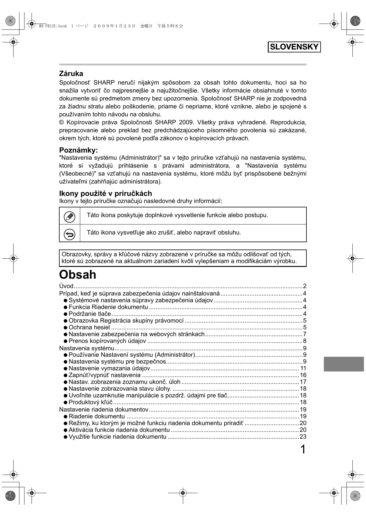 - SLOVENSKY Záruka Spoločnosť SHARP neručí nijakým spôsobom za obsah tohto dokumentu, hoci sa ho snažila vytvoriť čo najpresnejšie a najužitočnejšie. Všetky informácie obsiahnuté v tomto dokumente sú predmetom zmeny bez upozornenia. Spoločnosť SHARP nie je zodpovedná za žiadnu stratu alebo poškodenie, priame či nepriame, ktoré vznikne, alebo je spojené s používaním tohto návodu na obsluhu. © Kopírovacie práva Spoločnosti SHARP 2009. Všetky práva vyhradené. Reprodukcia, prepracovanie alebo preklad bez predchádzajúceho písomného povolenia sú zakázané, okrem tých, ktoré sú povolené podľa zákonov o kopírovacích právach. Poznámky: "Nastavenia systému (Administrátor)" sa v tejto príručke vzťahujú na nastavenia systému, ktoré si vyžadujú prihlásenie s právami administrátora, a "Nastavenia systému (Všeobecné)" sa vzťahujú na nastavenia systému, ktoré môžu byť prispôsobené bežnými užívateľmi (zahŕňajúc administrátora). Ikony použité v príručkách Ikony v tejto príručke označujú nasledovné druhy informácií: Táto ikona poskytuje doplnkové vysvetlenie funkcie alebo postupu. Táto ikona vysvetľuje ako zrušiť, alebo napraviť obsluhu. Obrazovky, správy a kľúčové názvy zobrazené v príručke sa môžu odlišovať od tých, ktoré sú zobrazené na aktuálnom zariadení kvôli vylepšeniam a modifikáciám výrobku. Obsah Úvod p. 2
