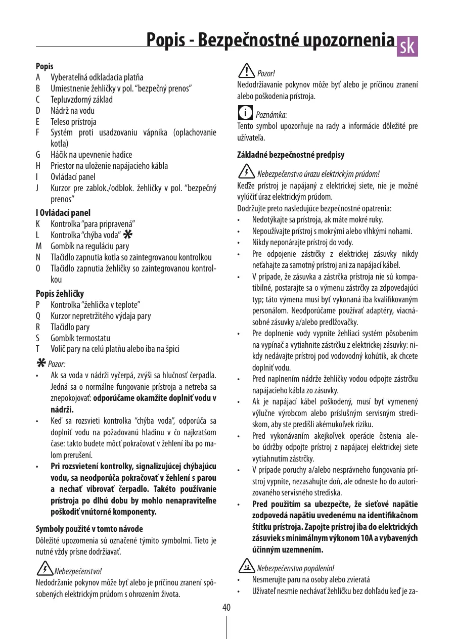 Popis - Bezpečnostné upozornenia sk Popis Pozor! Nedodržiavanie pokynov môže byť alebo je príčinou zranení alebo poškodenia prístroja. A Vyberateľná odkladacia platňa B Umiestnenie žehličky v pol. “bezpečný prenos” C Tepluvzdorný základ D Nádrž na vodu E Teleso prístroja F Systém proti usadzovaniu vápnika (oplachovanie kotla) G Háčik na upevnenie hadice H Priestor na uloženie napájacieho kábla I Ovládací panel J Kurzor pre zablok./odblok. žehličky v pol. “bezpečný prenos” I Ovládací panel K Kontrolka “para pripravená” L Kontrolka “chýba voda” M Gombík na reguláciu pary N Tlačidlo zapnutia kotla so zaintegrovanou kontrolkou O Tlačidlo zapnutia žehličky so zaintegrovanou kontrolkou Popis žehličky P Kontrolka “žehlička v teplote” Q Kurzor nepretržitého výdaja pary R Tlačidlo pary S Gombík termostatu T Volič pary na celú platňu alebo iba na špici Poznámka: Tento symbol upozorňuje na rady a informácie dôležité pre užívateľa. Základné bezpečnostné predpisy Symboly použité v tomto návode Dôležité upozornenia sú označené týmito symbolmi. Tieto je nutné vždy prísne dodržiavať. Nebezpečenstvo úrazu elektrickým prúdom! Keďže prístroj je napájaný z elektrickej siete, nie je možné vylúčiť úraz elektrickým prúdom. Dodržujte preto nasledujúce bezpečnostné opatrenia: