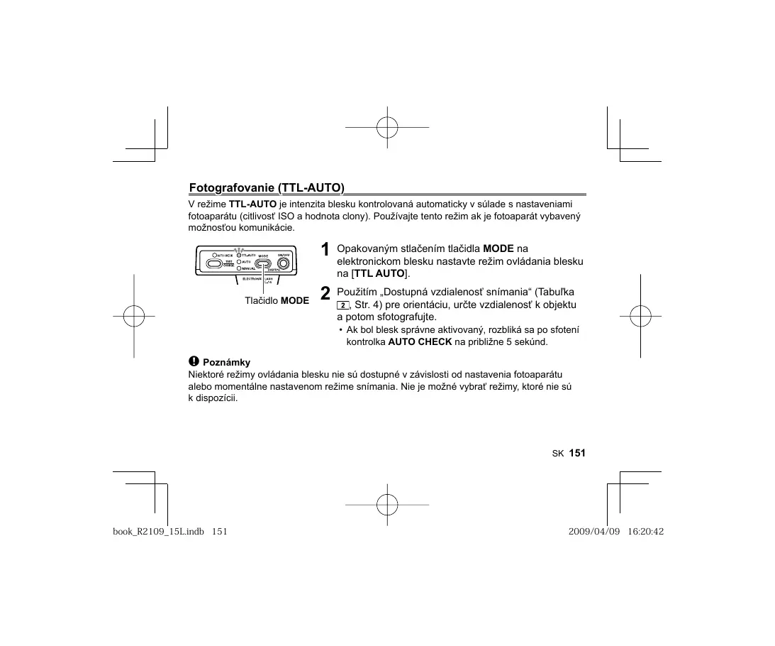 - Blesk je möglichnestostovat' pred fotenim; stlachte tlacidlo TEST pre kontrlu aktivacie blesku. Ak kontrlka AUTO CHECK blíká približne 5 sekünd, blesk je nastavený správné.