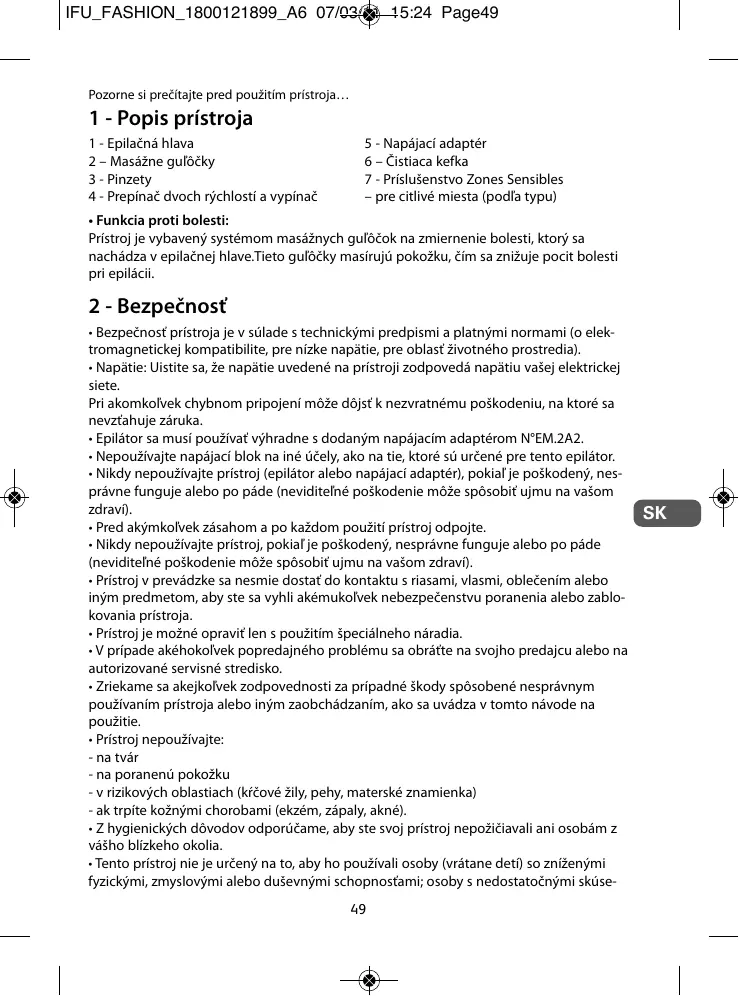• Bezpečnosť prístroja je v súlade s technickými predpismi a platnými normami (o elektromagnetickej kompatibilite, pre nízke napätie, pre oblasť životného prostredia). • Napätie: Uistite sa, že napätie uvedené na prístroji zodpovedá napätiu vašej elektrickej siete. Pri akomkoľvek chybnom pripojení môže dôjsť k nezvratnému poškodeniu, na ktoré sa nevzťahuje záruka. • Epilátor sa musí používať výhradne s dodaným napájacím adaptérom N°EM.2A2. • Nepoužívajte napájací blok na iné účely, ako na tie, ktoré sú určené pre tento epilátor. • Nikdy nepoužívajte prístroj (epilátor alebo napájací adaptér), pokiaľ je poškodený, nesprávne funguje alebo po páde (neviditeľné poškodenie môže spôsobiť ujmu na vašom zdraví). • Pred akýmkoľvek zásahom a po každom použití prístroj odpojte. • Nikdy nepoužívajte prístroj, pokiaľ je poškodený, nesprávne funguje alebo po páde (neviditeľné poškodenie môže spôsobiť ujmu na vašom zdraví). • Prístroj v prevádzke sa nesmie dostať do kontaktu s riasami, vlasmi, oblečením alebo iným predmetom, aby ste sa vyhli akémukoľvek nebezpečenstvu poranenia alebo zablokovania prístroja. • Prístroj je možné opraviť len s použitím špeciálneho náradia. • V prípade akéhokoľvek popredajného problému sa obráťte na svojho predajcu alebo na autorizované servisné stredisko. • Zriekame sa akejkoľvek zodpovednosti za prípadné škody spôsobené nesprávnym používaním prístroja alebo iným zaobchádzaním, ako sa uvádza v tomto návode na použitie. • Prístroj nepoužívajte: - na tvár - na poranenú pokožku - v rizikových oblastiach (kŕčové žily, pehy, materské znamienka) - ak trpíte kožnými chorobami (ekzém, zápaly, akné). • Z hygienických dôvodov odporúčame, aby ste svoj prístroj nepožičiavali ani osobám z vášho blízkeho okolia. • Tento prístroj nie je určený na to, aby ho používali osoby (vrátane detí) so zníženými fyzickými, zmyslovými alebo duševnými schopnosťami; osoby s nedostatočnými skúse-