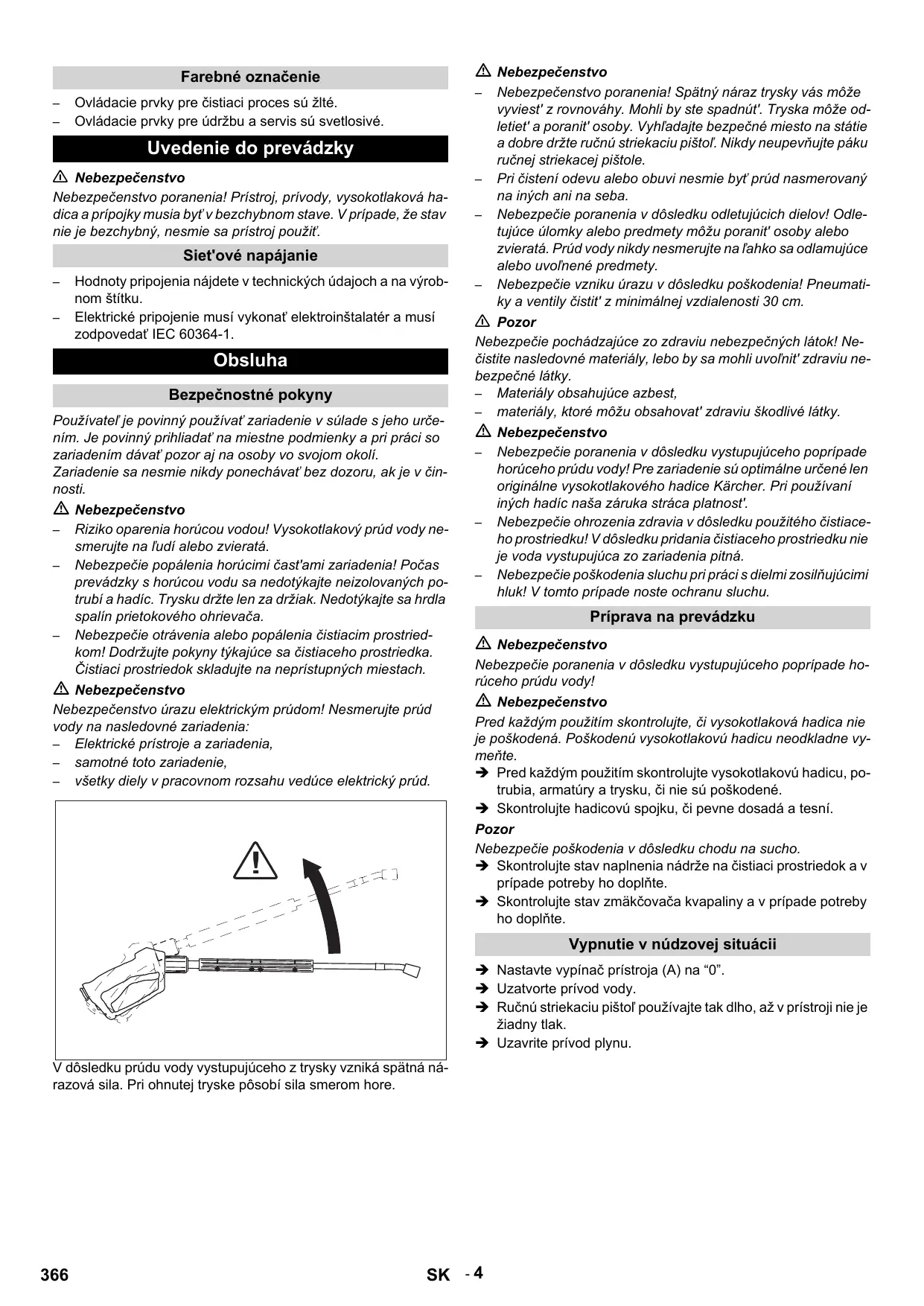 Príprava na prevádzku Nebezpečenstvo Nebezpečie poranenia v dôsledku vystupujúceho poprípade horúceho prúdu vody! Nebezpečenstvo Pred každým použitím skontrolujte, či vysokotlaková hadica nie je poškodená. Poškodenú vysokotlakovú hadicu neodkladne vymeňte. Pred každým použitím skontrolujte vysokotlakovú hadicu, potrubia, armatúry a trysku, či nie sú poškodené. Skontrolujte hadicovú spojku, či pevne dosadá a tesní. Pozor Nebezpečie poškodenia v dôsledku chodu na sucho. Skontrolujte stav naplnenia nádrže na čistiaci prostriedok a v prípade potreby ho doplňte. Skontrolujte stav zmäkčovača kvapaliny a v prípade potreby ho doplňte. Vypnutie v núdzovej situácii Nastavte vypínač prístroja (A) na “0”. Uzatvorte prívod vody. Ručnú striekaciu pištoľ používajte tak dlho, až v prístroji nie je žiadny tlak. Uzavrite prívod plynu. V dôsledku prúdu vody vystupujúceho z trysky vzniká spätná nárazová sila. Pri ohnutej tryske pôsobí sila smerom hore.