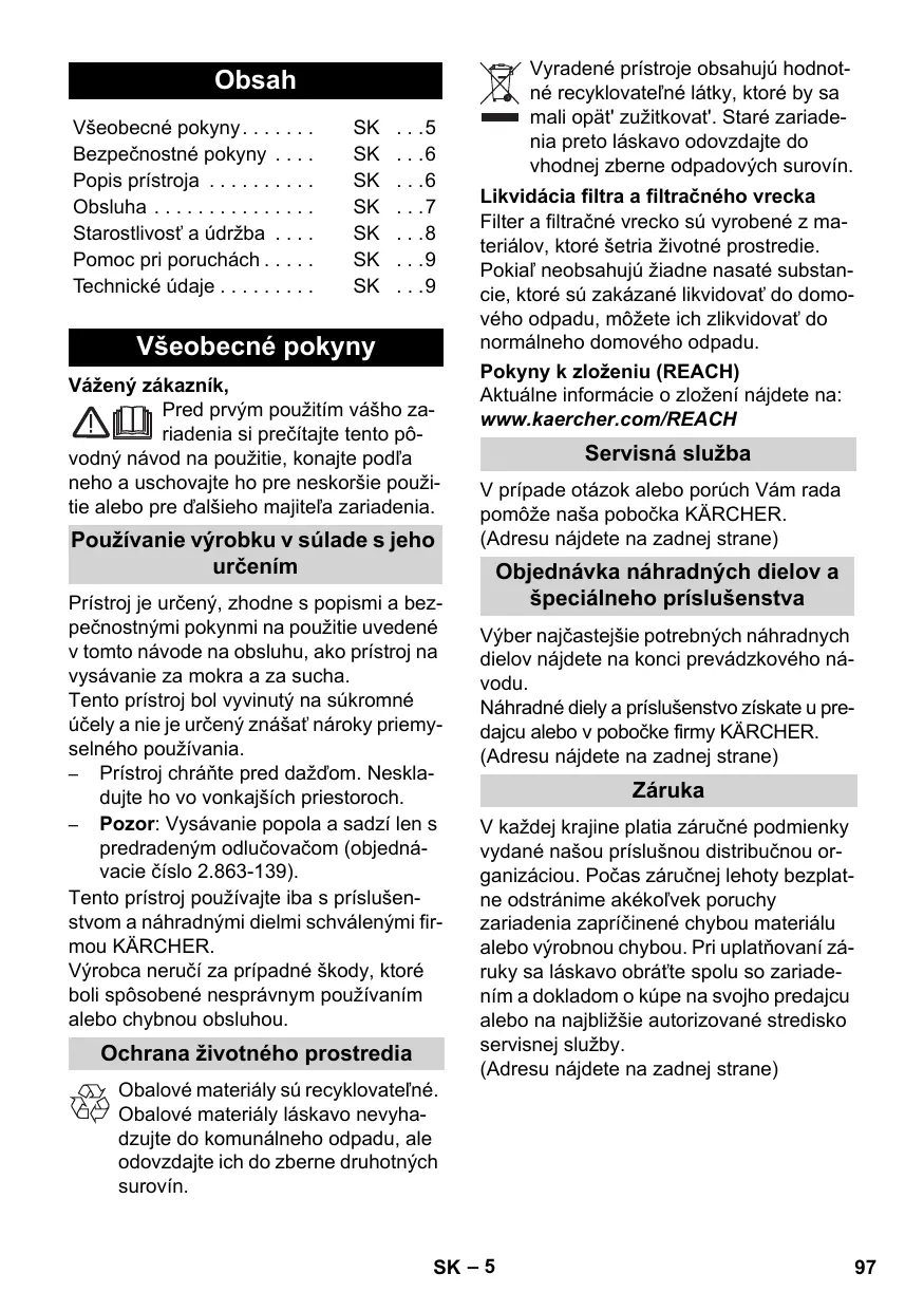 Všeobecné pokyny Vážený zákazník, Pred prvým použitím vášho zariadenia si prečítajte tento pôvodný návod na použitie, konajte podľa neho a uschovajte ho pre neskoršie použitie alebo pre ďalšieho majiteľa zariadenia. Používanie výrobku v súlade s jeho určením Prístroj je určený, zhodne s popismi a bezpečnostnými pokynmi na použitie uvedené v tomto návode na obsluhu, ako prístroj na vysávanie za mokra a za sucha. Tento prístroj bol vyvinutý na súkromné účely a nie je určený znášať nároky priemyselného používania. – Prístroj chráňte pred dažďom. Neskladujte ho vo vonkajších priestoroch. – Pozor: Vysávanie popola a sadzí len s predradeným odlučovačom (objednávacie číslo 2.863-139). Tento prístroj používajte iba s príslušenstvom a náhradnými dielmi schválenými firmou KÄRCHER. Výrobca neručí za prípadné škody, ktoré boli spôsobené nesprávnym používaním alebo chybnou obsluhou. Ochrana životného prostredia Obalové materiály sú recyklovateľné. Obalové materiály láskavo nevyhadzujte do komunálneho odpadu, ale odovzdajte ich do zberne druhotných surovín. Likvidácia filtra a filtračného vrecka Filter a filtračné vrecko sú vyrobené z materiálov, ktoré šetria životné prostredie. Pokiaľ neobsahujú žiadne nasaté substancie, ktoré sú zakázané likvidovať do domového odpadu, môžete ich zlikvidovať do normálneho domového odpadu. Pokyny k zloženiu (REACH) Aktuálne informácie o zložení nájdete na: www.kaercher.com/REACH Servisná služba V prípade otázok alebo porúch Vám rada pomôže naša pobočka KÄRCHER. (Adresu nájdete na zadnej strane) Objednávka náhradných dielov a špeciálneho príslušenstva Výber najčastejšie potrebných náhradnych dielov nájdete na konci prevádzkového návodu. Náhradné diely a príslušenstvo získate u predajcu alebo v pobočke firmy KÄRCHER. (Adresu nájdete na zadnej strane) Záruka V každej krajine platia záručné podmienky vydané našou príslušnou distribučnou organizáciou. Počas záručnej lehoty bezplatne odstránime akékoľvek poruchy zariadenia zapríčinené chybou materiálu alebo výrobnou chybou. Pri uplatňovaní záruky sa láskavo obráťte spolu so zariadením a dokladom o kúpe na svojho predajcu alebo na najbližšie autorizované stredisko servisnej služby. (Adresu nájdete na zadnej strane) SK – 5